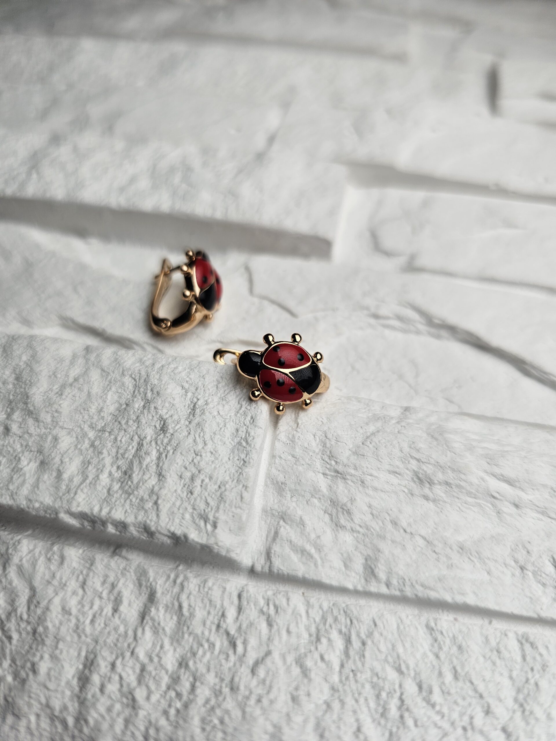 Ryškūs auskarai su boružėlės motyvu. Raudona emalė suteikia žaismingo kontrasto, o užsegimas stabiliai laiko auskarą kasdien. Modelis patrauklus ir vaikams, ir suaugusioms.