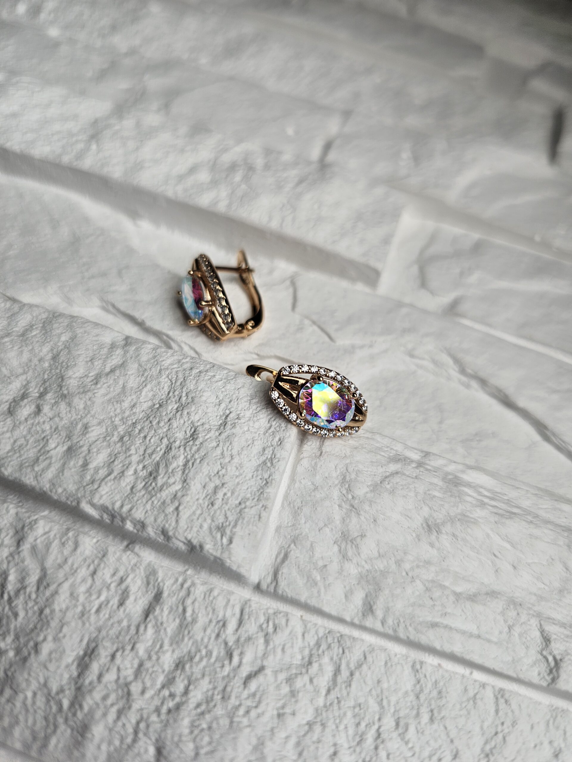 Spindintys auskarai su žvilgančiais daugiaspalviais kristalais, primenančiais šiaurės pašvaistės šviesas. Auksinės linijos ir smulkūs akmenukai aplink pagrindinį kristalą sukuria subtilų prabangos pojūtį. Tobulas pasirinkimas tiek vakariniam įvaizdžiui, tiek ypatingai progai.