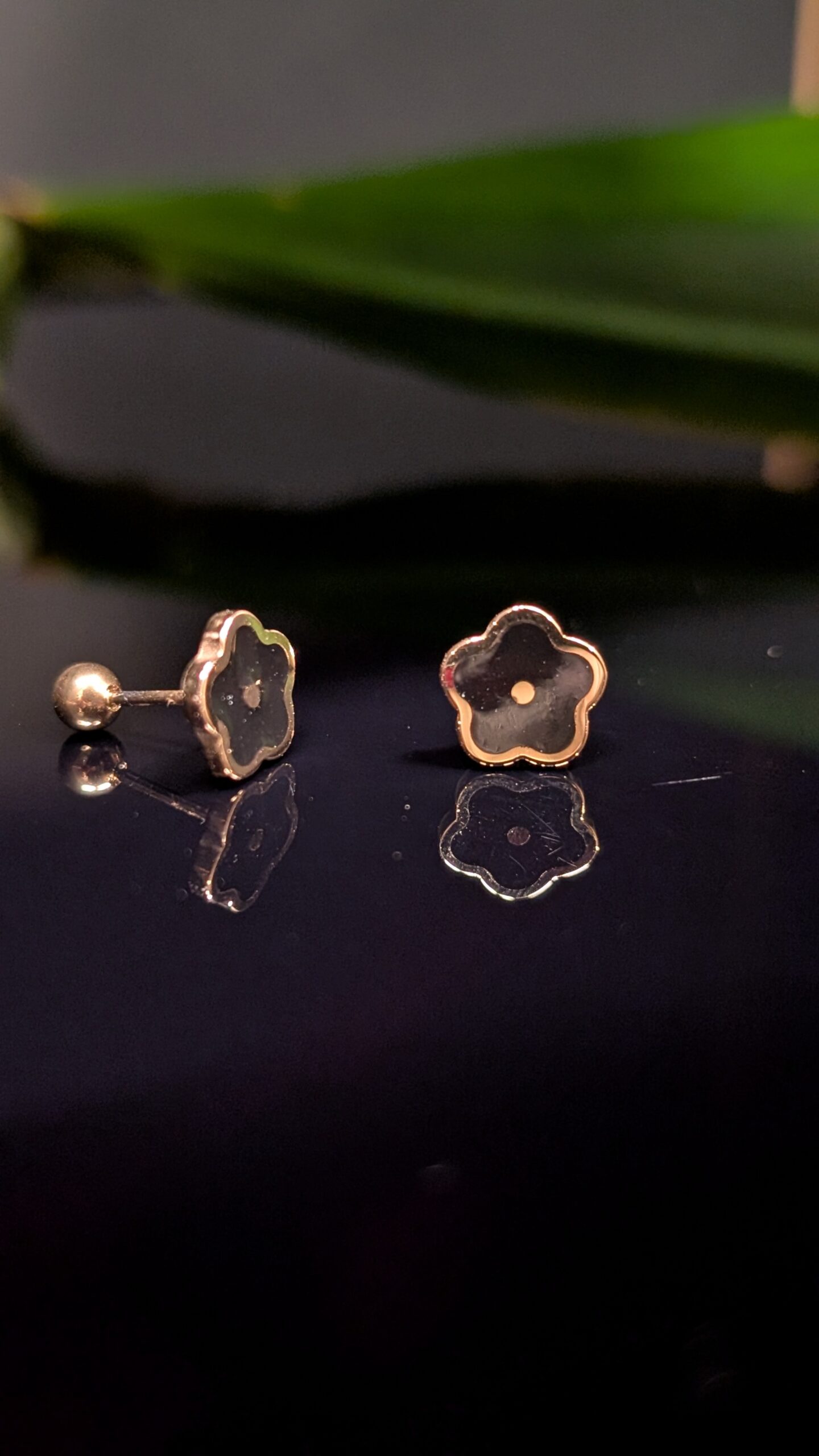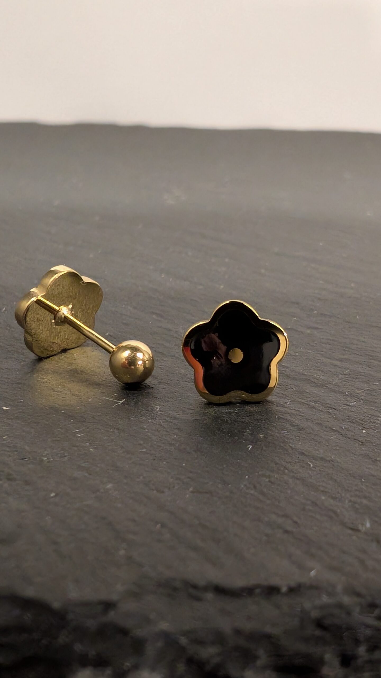 Mieli auksinės spalvos auskarai su juodu gėlytės formos akcentu. Lengvai derinami prie įvairaus stiliaus ir suteikiantys subtilaus, elegantiško žavesio jūsų įvaizdžiui.