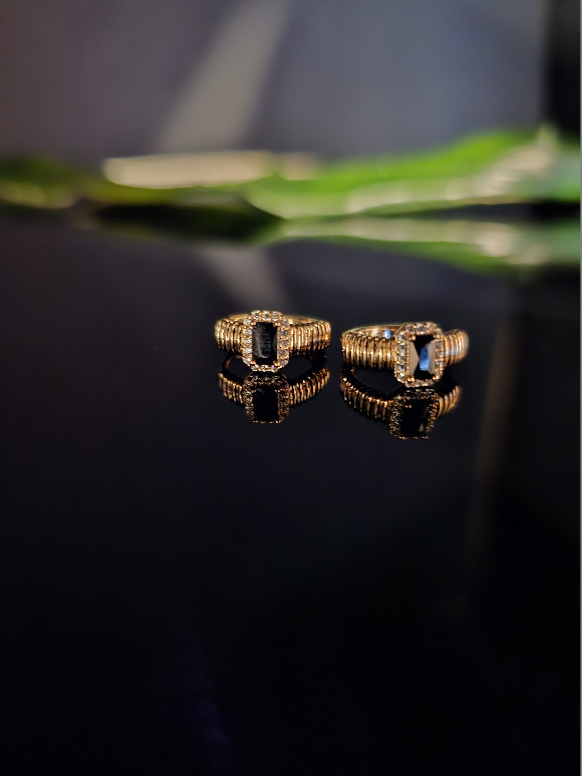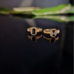 Išskirtinio dizaino auskarai su stačiakampiu juodu akmeniu, apsuptu smulkių žėrinčių kristalų. Aukso atspalvio pagrindas suteikia prabangos, o juodas akmuo išryškina paslaptingą bei modernų stilių. Puikus pasirinkimas iškilmingoms progoms ar vakariniam įvaizdžiui.