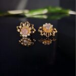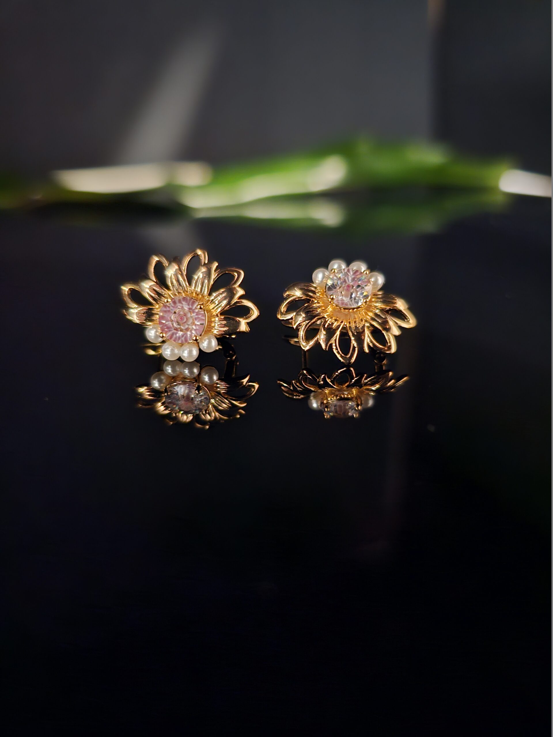 Išskirtinio grožio auskarai gėlės formos, puošiami žėrinčiu akmeniu centre ir subtiliomis perlamutrio detalėmis. Auksinis pagrindas suteikia šilumos bei prabangos, o gėliškas dizainas simbolizuoja lengvumą ir natūralų žavesį. Puikus pasirinkimas moteriškam, romantiškam įvaizdžiui.