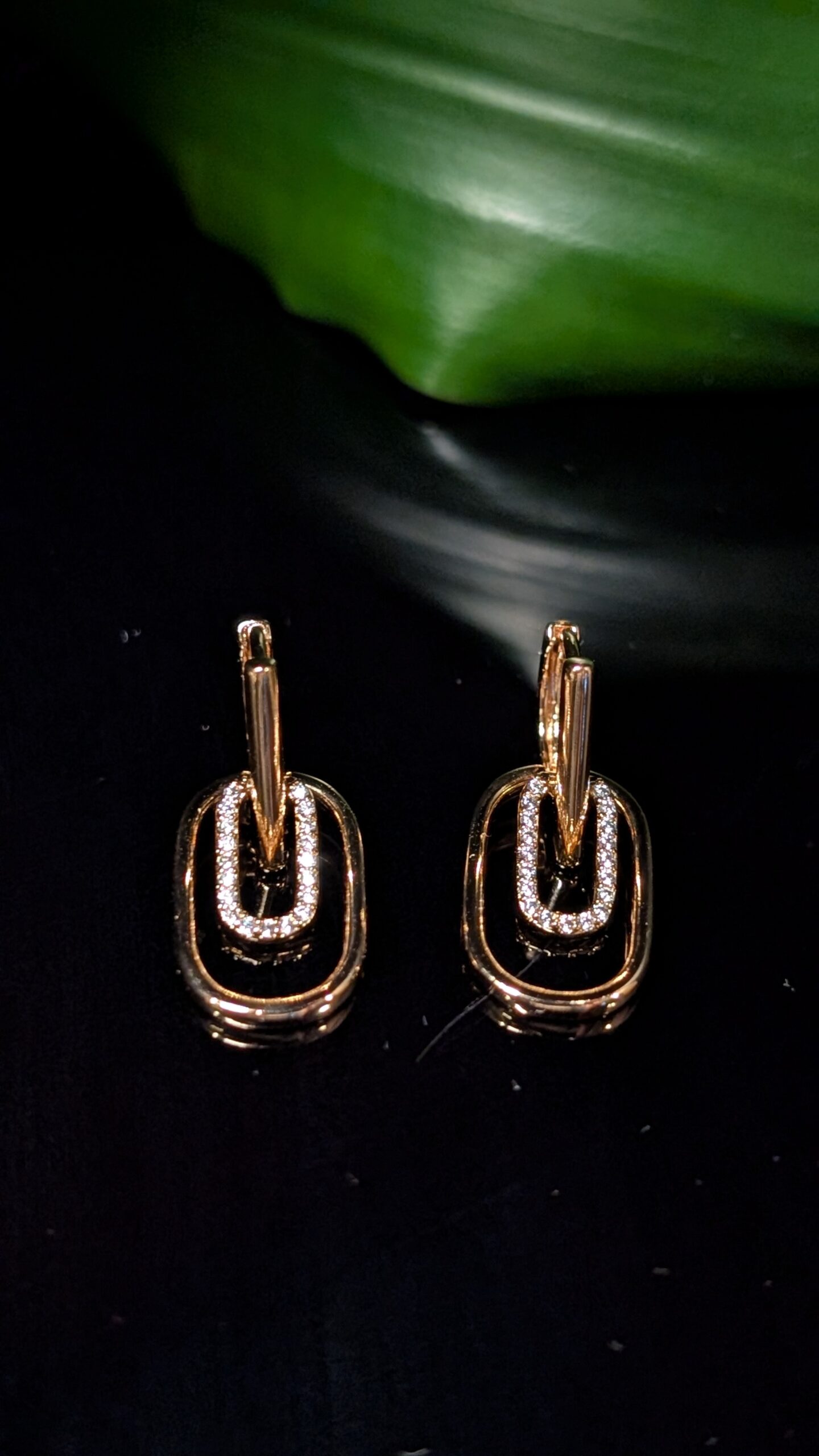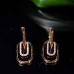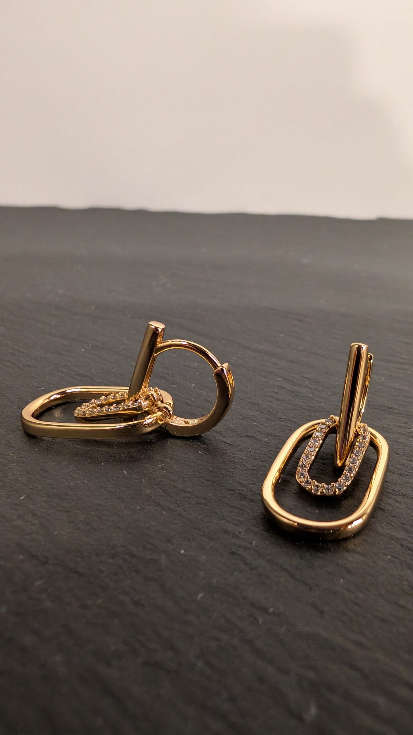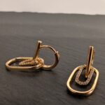 Modernūs auksinės spalvos auskarai, dekoruoti dviem tarpusavyje susipynusiais stačiakampio formos žiedais – vienas lygus, kitas spindintis cirkonio akmenukais. Stilingas akcentas, suteikiantis elegancijos ir išskirtinumo bet kokiam įvaizdžiui.
