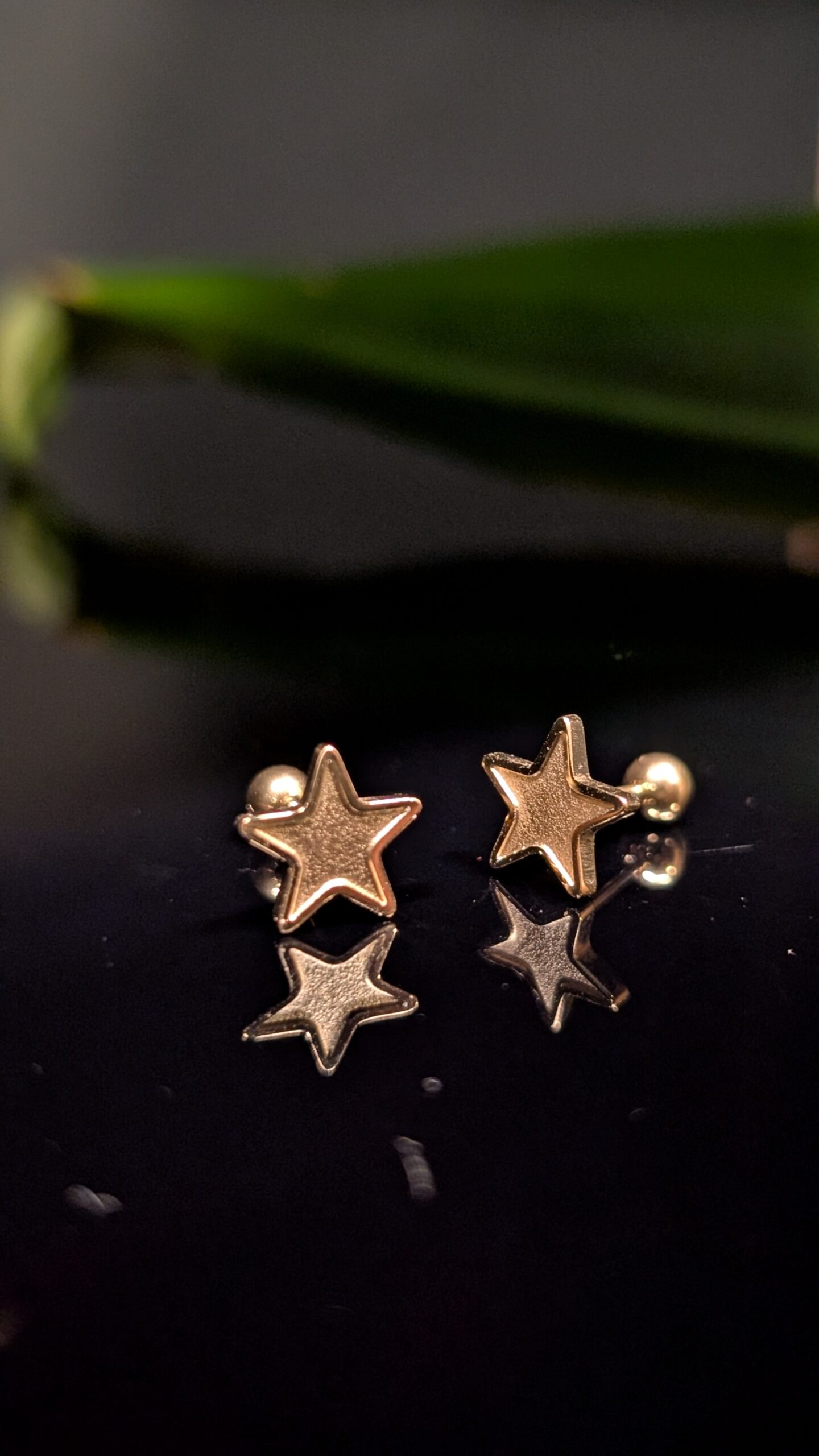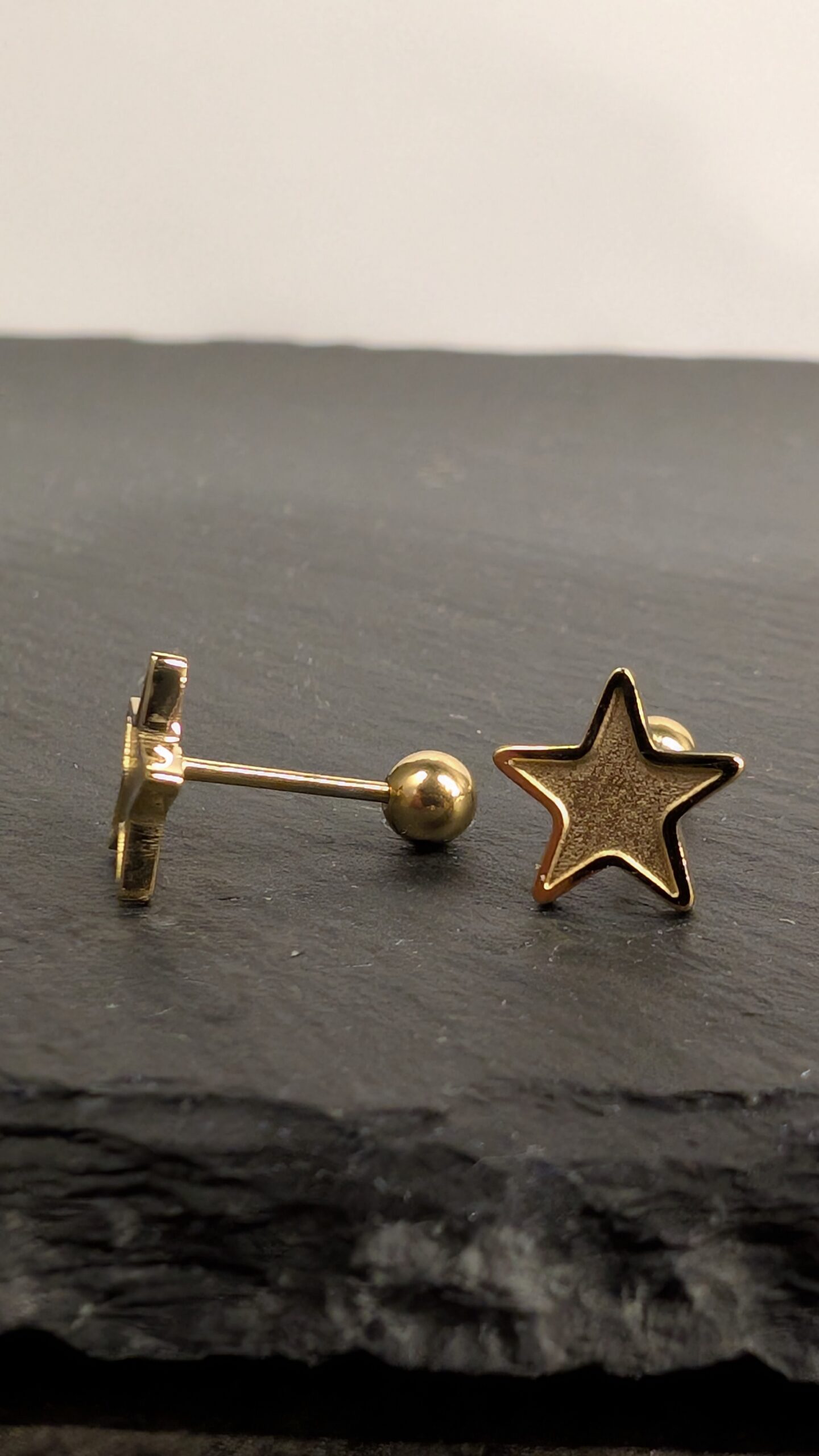 Žaismingi ir subtilūs auskarai žvaigždės formos, auksinės spalvos. Lengvi ir patogūs, jie suteikia įvaizdžiui spindesio bei jaunatviško žavesio. Puikiai tinka kasdieniam nešiojimui ar dovanai artimam žmogui.