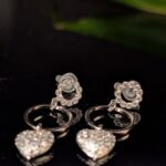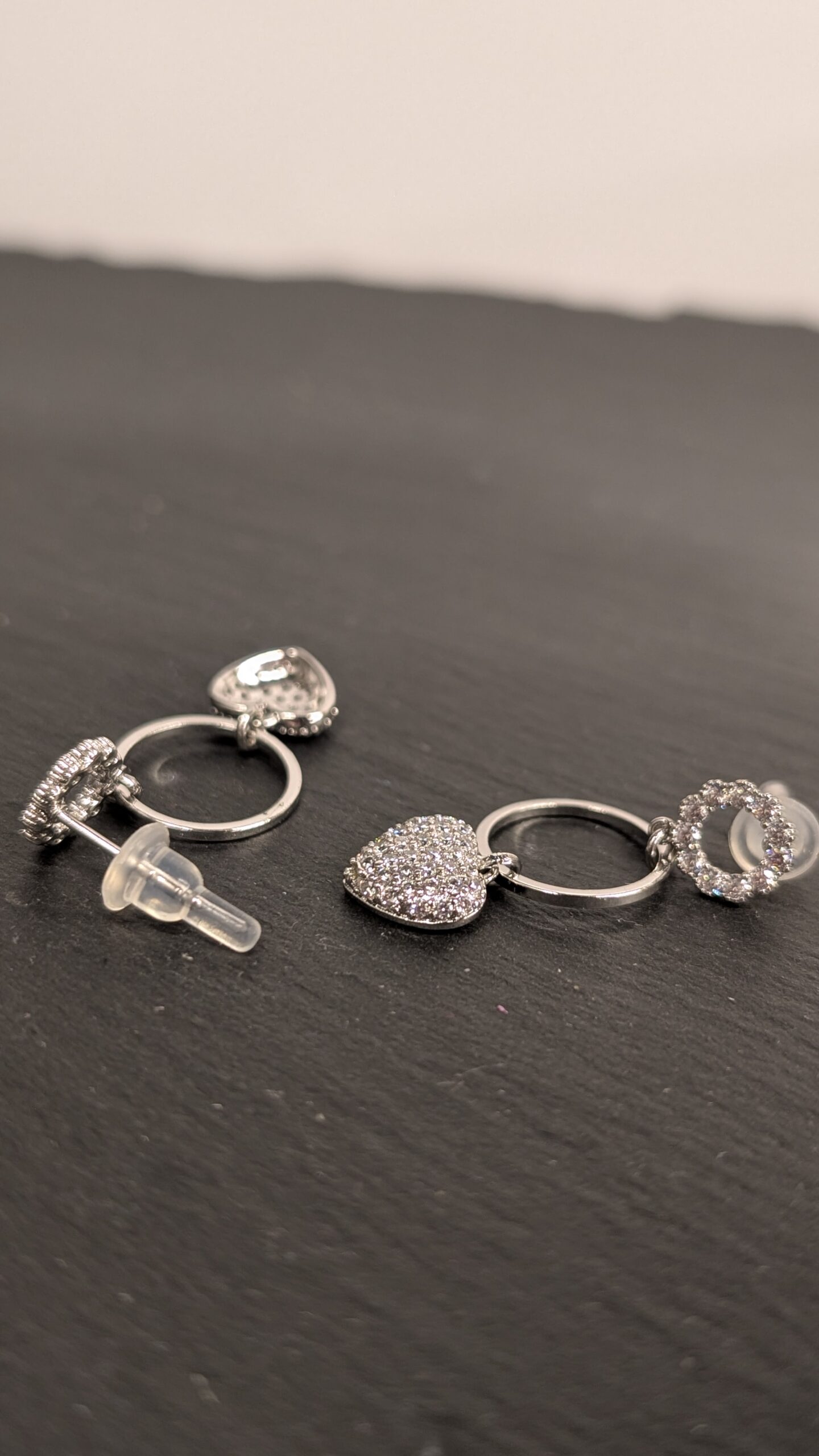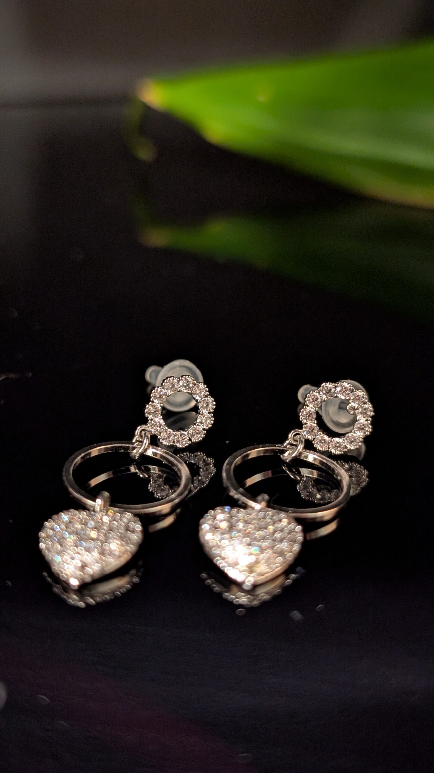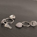 Sidabro spalvos auskaras su žėrinčia širdelės formos pakabuku ir akmenukais puošta detale. Spindintis akcentas, suteikiantis romantiško žavesio ir elegancijos kiekvienam įvaizdžiui.