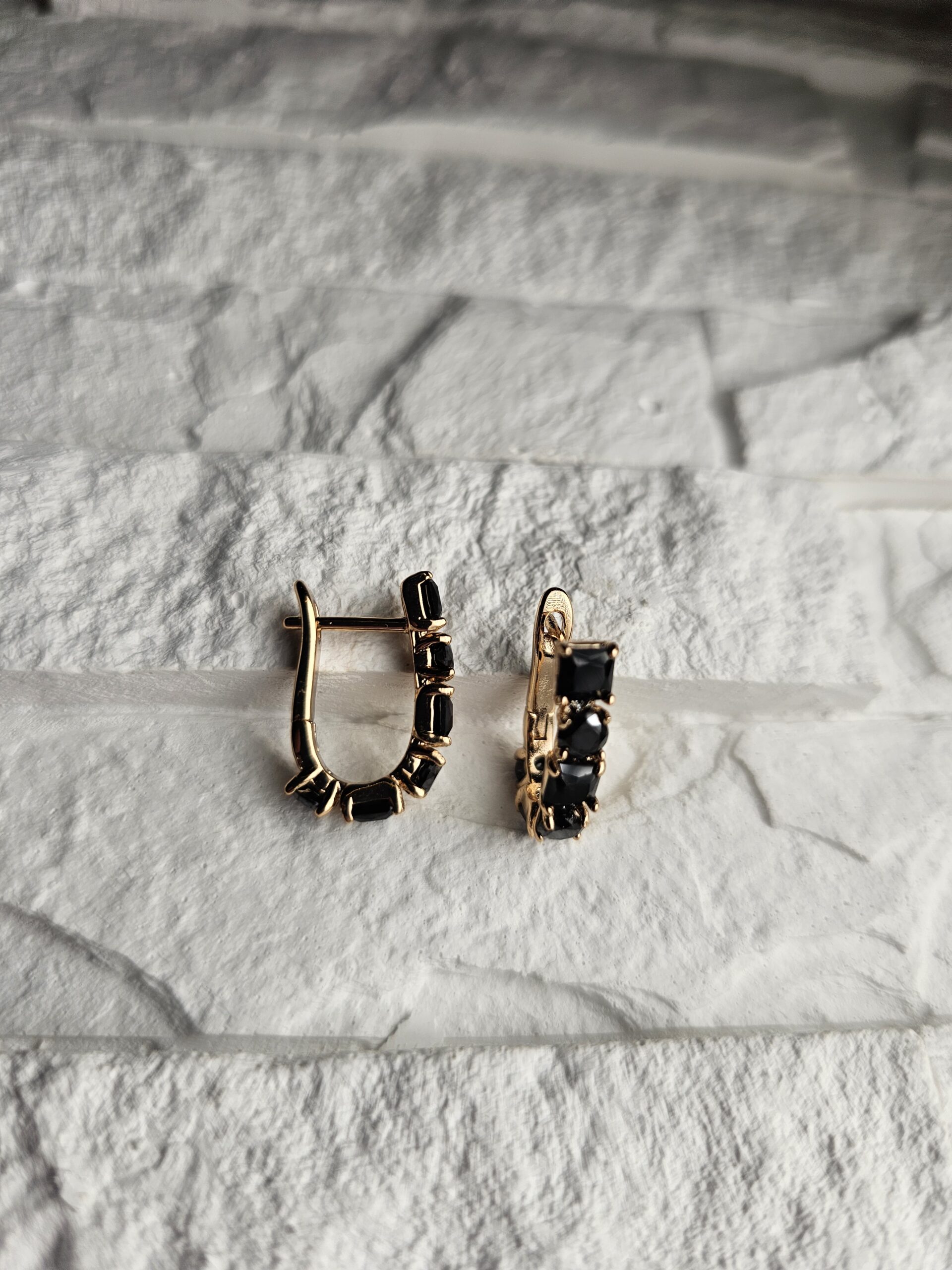 Išskirtinio dizaino auskarai su juodais stačiakampiais akmenimis – elegancijos ir paslapties simbolis. Auksinis pagrindas subtiliai kontrastuoja su tamsiais kristalais, suteikdamas auskarams prabangos ir šiuolaikiško žavesio.