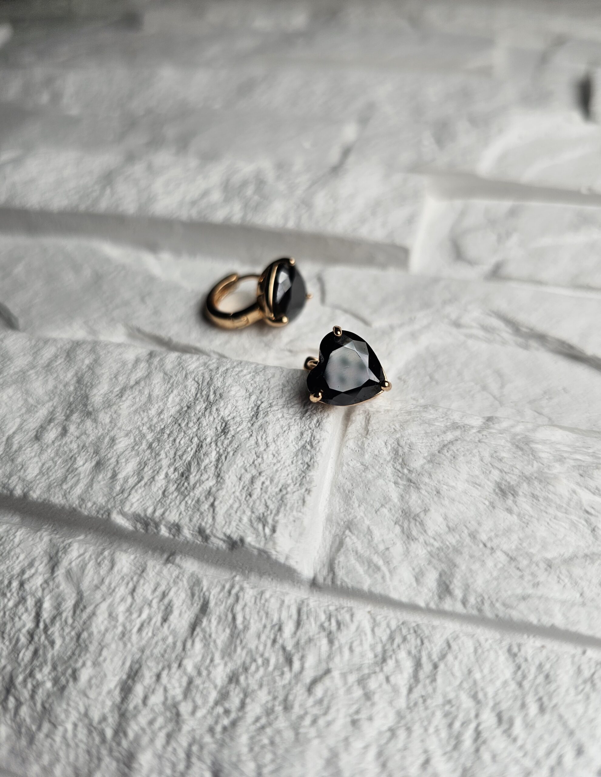 Auskarai su juodu širdelės formos akmeniu spinduliuoja paslaptingu žavesiu ir subtilia elegancija. Auksinis pagrindas suteikia šilumos kontrastą tamsiam akmens spindesiui – tai puikus pasirinkimas moterims, mėgstančioms išskirtinumą ir stilių.