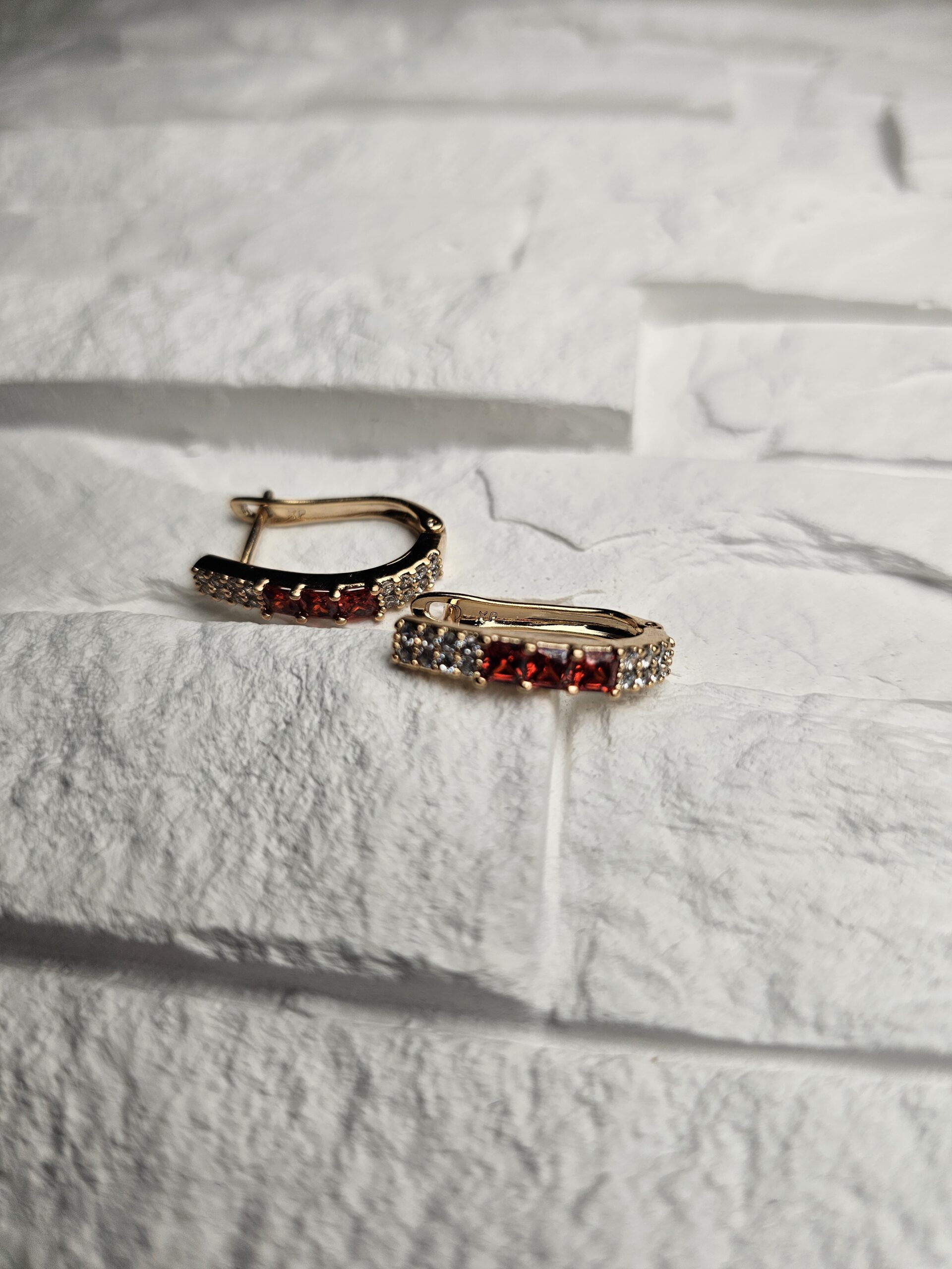 Šie auskarai žavi savo subtiliu kontrastu – ryškiai raudoni kristalai įrėminti švytinčiais cirkoniais ant auksinės bazės. Jie spinduliuoja pasitikėjimu ir aistra, puikiai papildydami tiek kasdienį, tiek vakarinį įvaizdį.