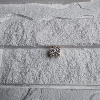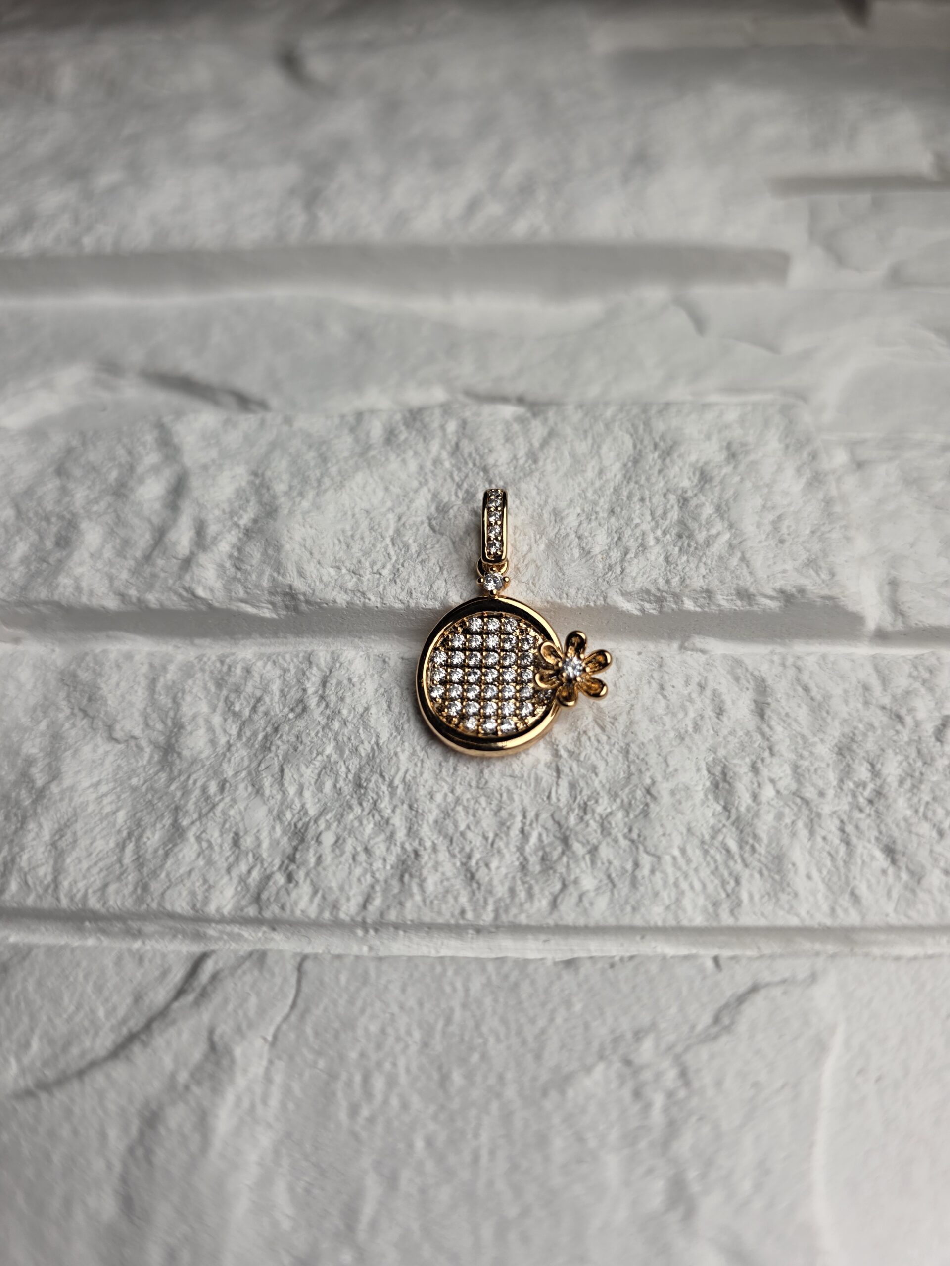 Auksinės spalvos pakabukas su tankiai žėrinčių cirkonio kristalų paviršiumi ir subtilia gėlytės detale šone. Lengvas, universalus ir tinkantis tiek kasdienai, tiek šventėms.
