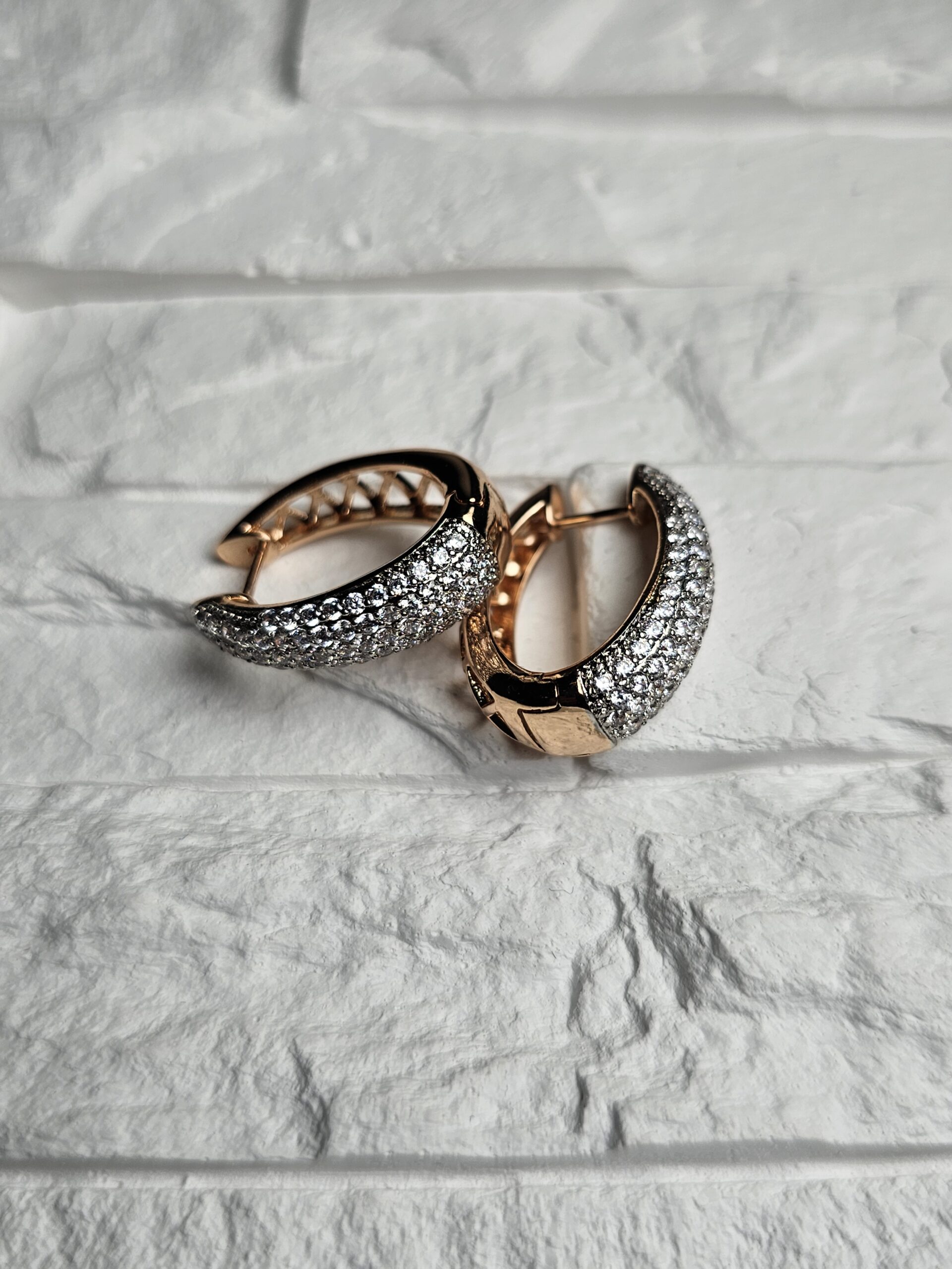 Prabangūs auskarai, gausiai inkrustuoti žėrinčiais kristalais, kurie sukuria išskirtinį spindesio efektą. Auksinis pagrindas suteikia šilumos ir rafinuotumo, o apvalinta forma pabrėžia eleganciją ir klasikinį stilių. Tobulas pasirinkimas ypatingoms progoms ar vakaro įvaizdžiui.