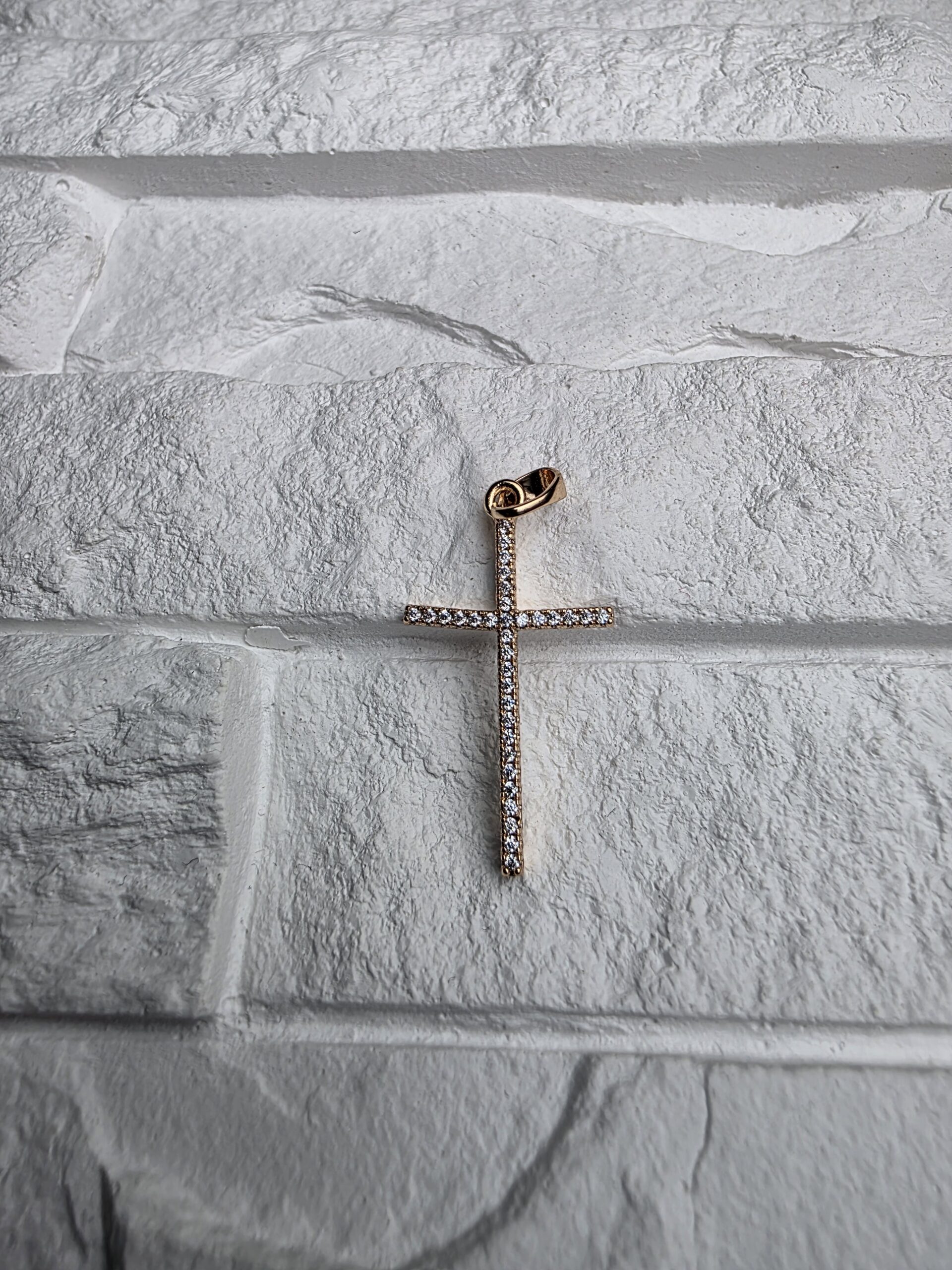 Plonas, pailgos formos kryžiaus pakabukas iš auksinės spalvos medicininio metalo. Visas paviršius nusagstytas aiškiai žvilgančiais cirkoniais, todėl aksesuaras atrodo ryškiai, bet išlaiko švarią liniją. Tinka kasdienai ir išskirtinėms progoms.