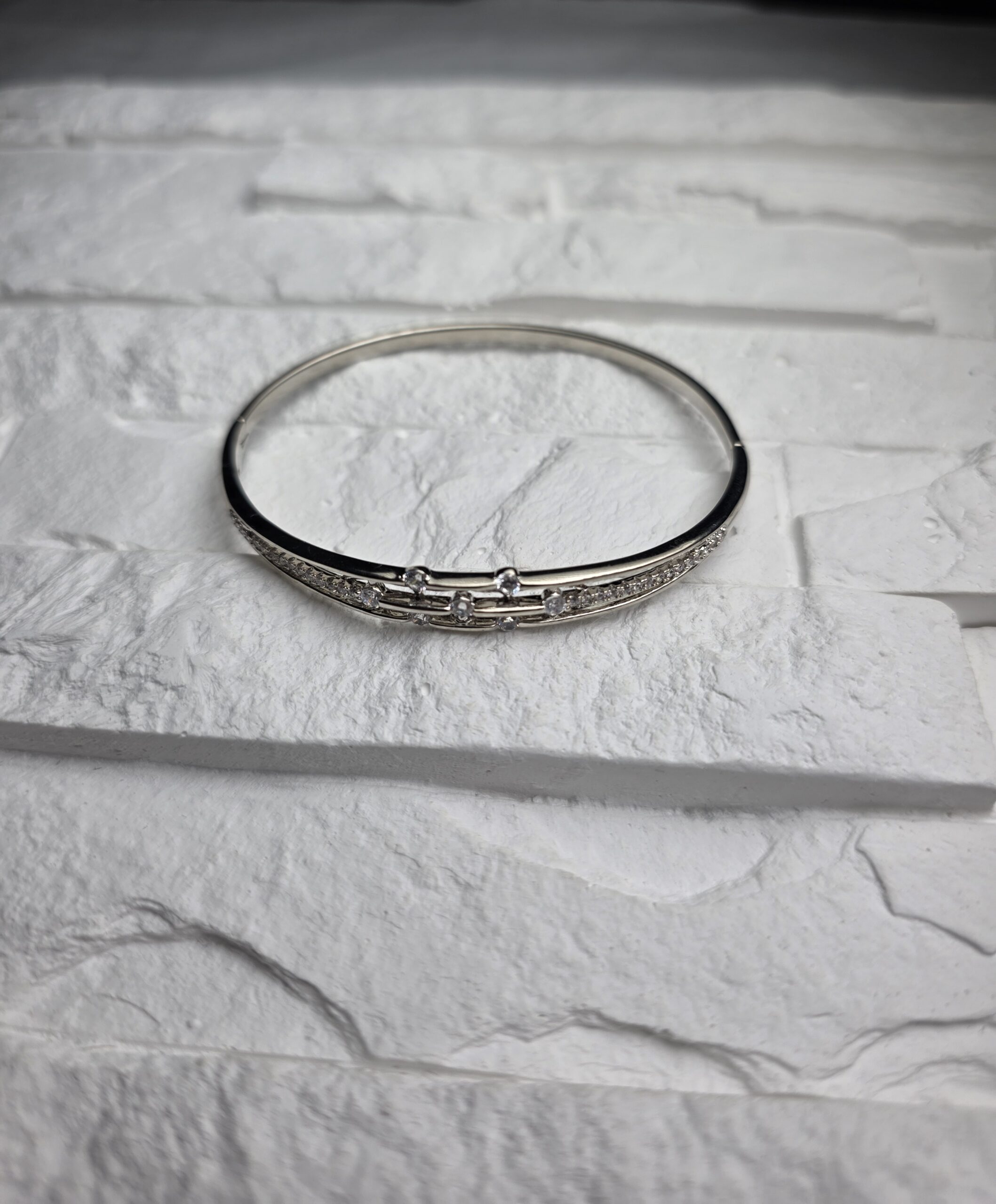 Standi sidabrinė apyrankė su tiesia kristalų linija per centrą. Modelis atrodo tvarkingai ir švariai, todėl tinka tiek kasdien, tiek vakarui. Konstrukcija stabili, paviršius blizgus.