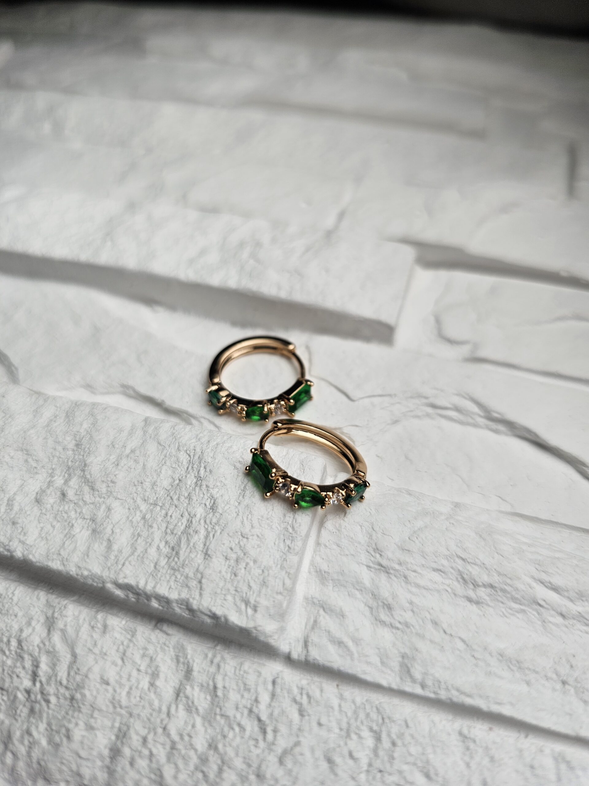 Auksinės spalvos lankelio tipo auskarai su ryškiais žaliais akmenimis ir smulkiais cirkoniais. Minimalus dydis, tvarkinga forma ir tvirtas užsegimas leidžia auskarams išlikti patogiems visą dieną.