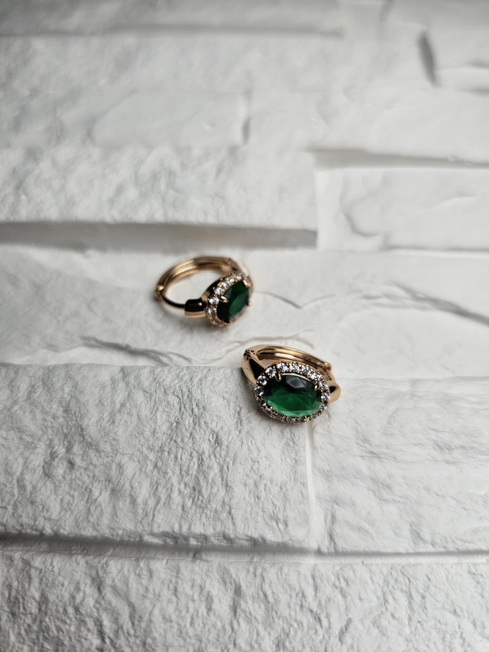 Auksinės spalvos auskarai su žaliu akmeniu – išraiškingas klasikos ir švelnaus žavesio derinys. Spindintys kristalai aplink akmenį suteikia elegancijos, o sodri žalia spalva išsiskiria subtiliu prabangos pojūčiu. Tinka tiek šventiniam, tiek kasdieniam stiliui.