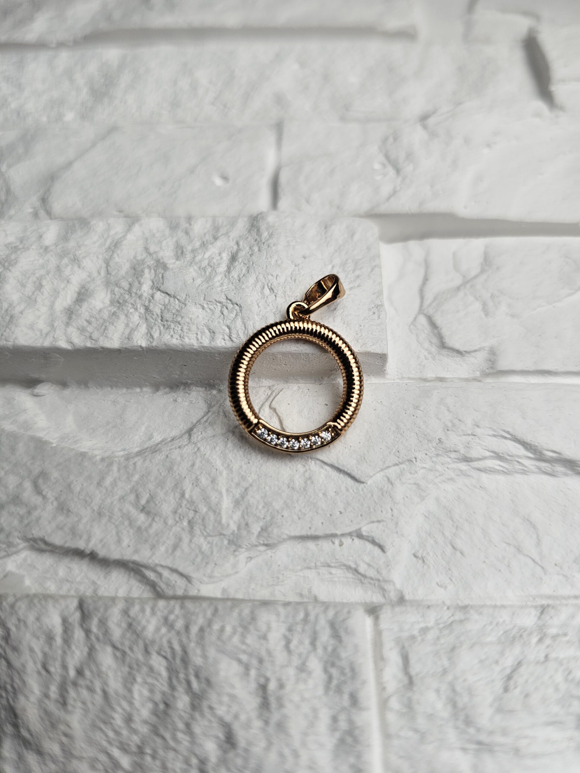 Subtilaus dizaino auksinis pakabukas apskritimo formos, puoštas žėrinčiais kristalais apatinėje dalyje. Apskritimas simbolizuoja amžinybę, darną ir gyvenimo ciklą, todėl šis papuošalas puikiai tiks tiek kasdienai, tiek ypatingoms progoms.