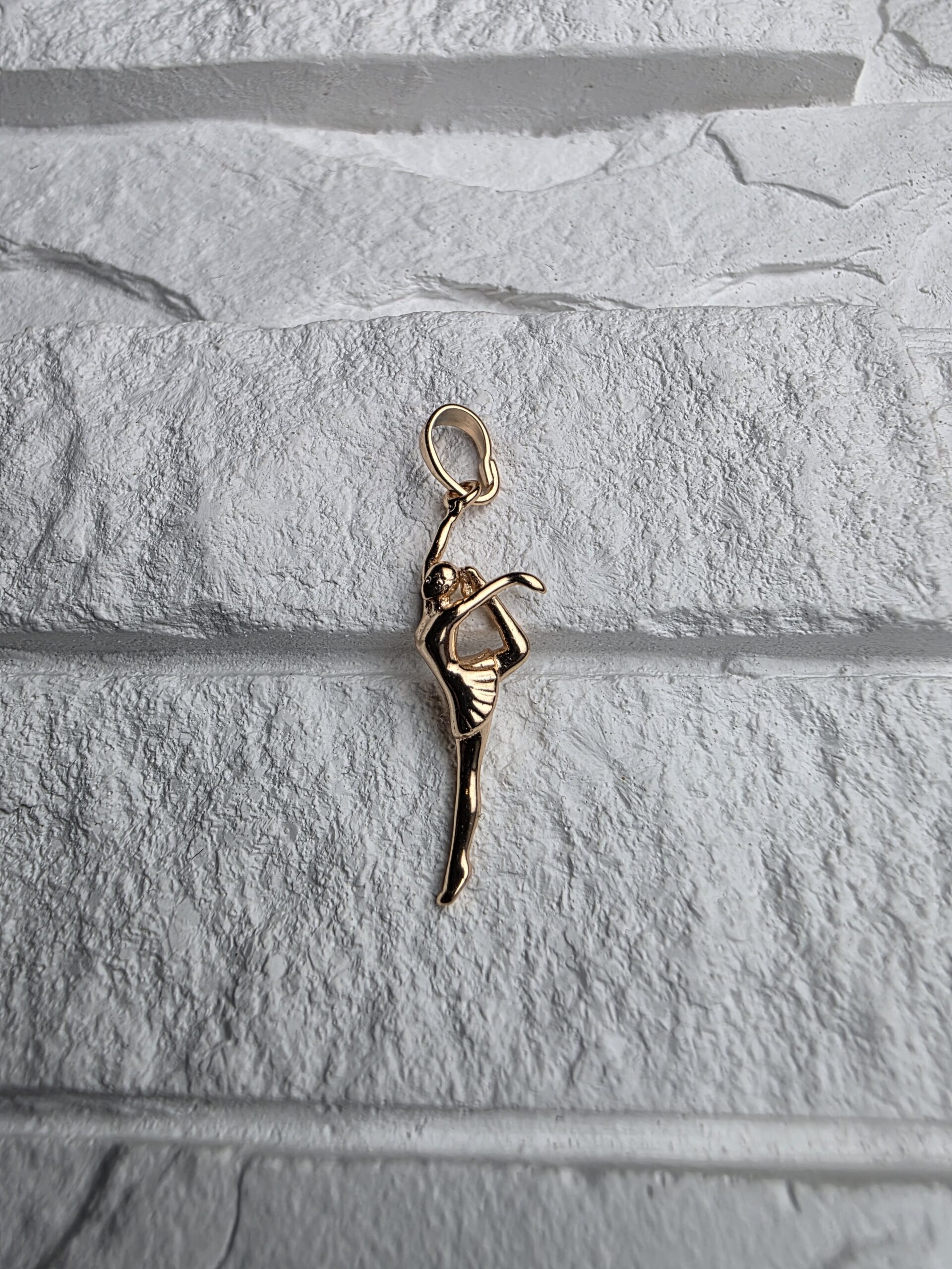 Auksinės spalvos pakabukas, vaizduojantis elegantišką baleriną judesio pozoje. Plonas, lengvas ir subtilus akcentas, tinkantis kasdieniam ar šventiniam įvaizdžiui.