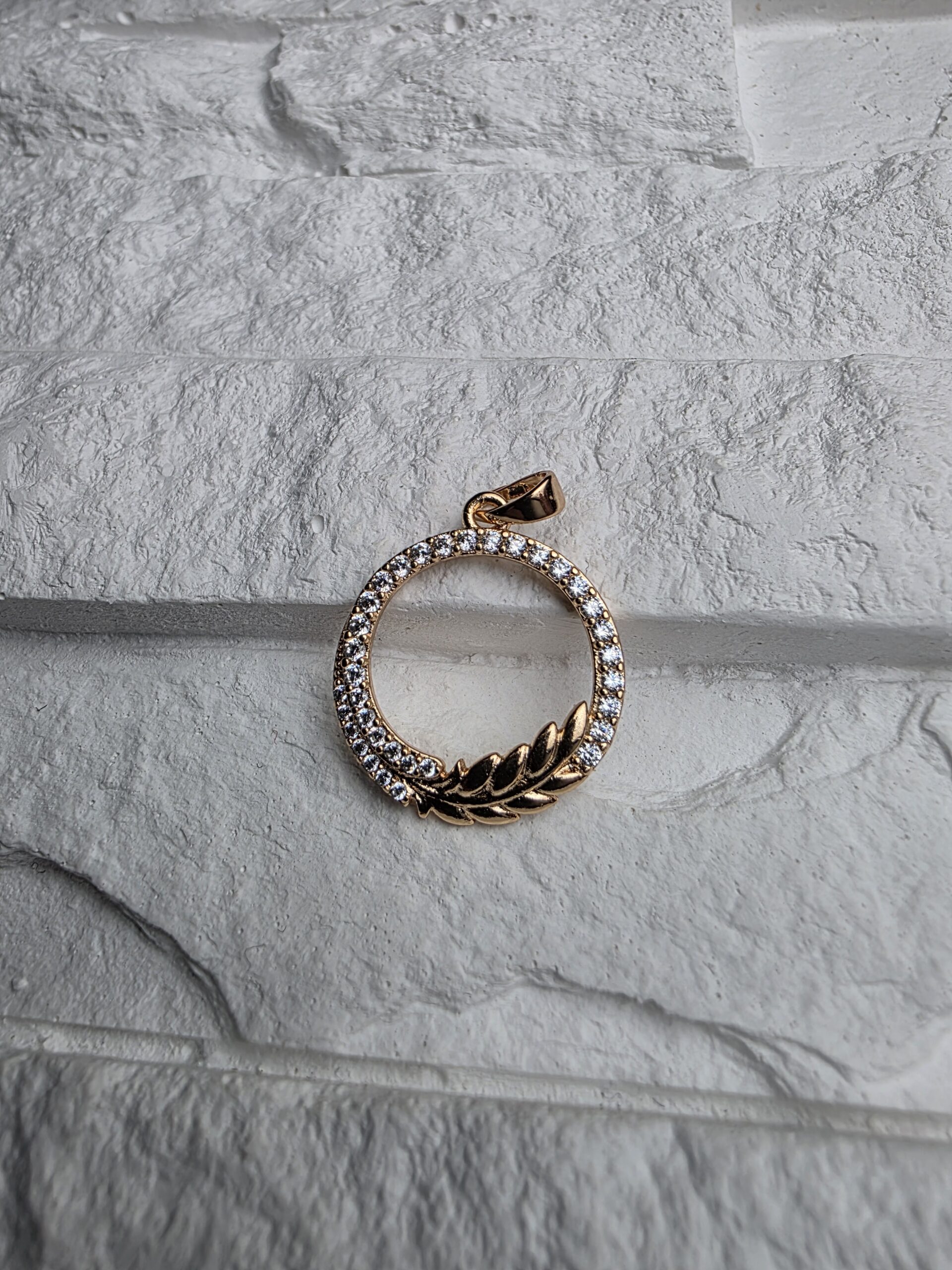 Auksinės spalvos apskritimas su ryškiai spindinčiais kristalais ir laurų šakele apačioje. Lengvas, švarus dizainas suteikia elegancijos, tinka tiek kasdien, tiek kaip akcentas prie vakarinės aprangos.