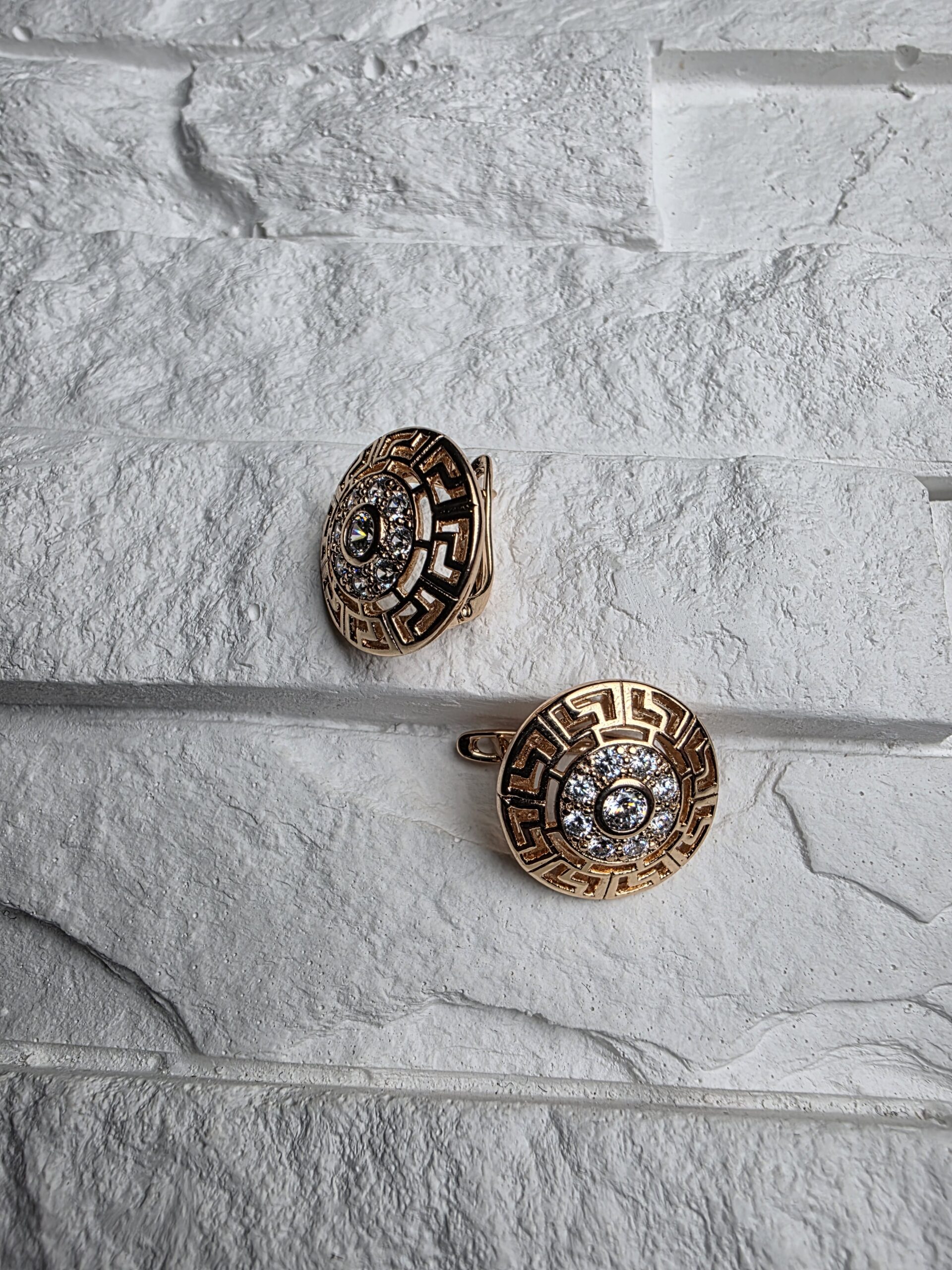 Auksinės spalvos auskarai su ryškiu geometriniu raštu ir cirkonių centru. Tvirti, užsegami lankelio tipo mechanizmu, todėl išlieka stabilūs ir patogūs dėvėti kasdien.