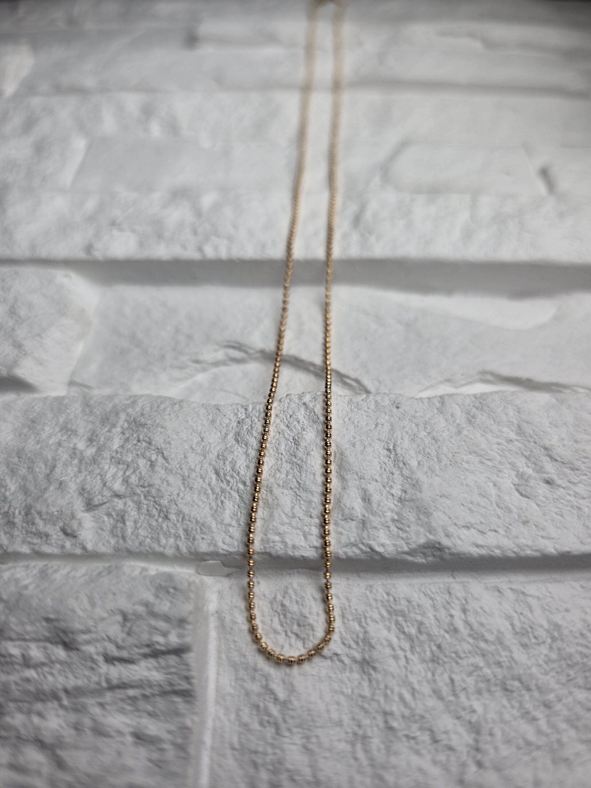 Smulkių auksinių karoliukų grandinėlė. Lengva ir lygi, tinkama solo nešiojimui arba derinimui su mažais pakabukais. Universalus minimalistinis akcentas.