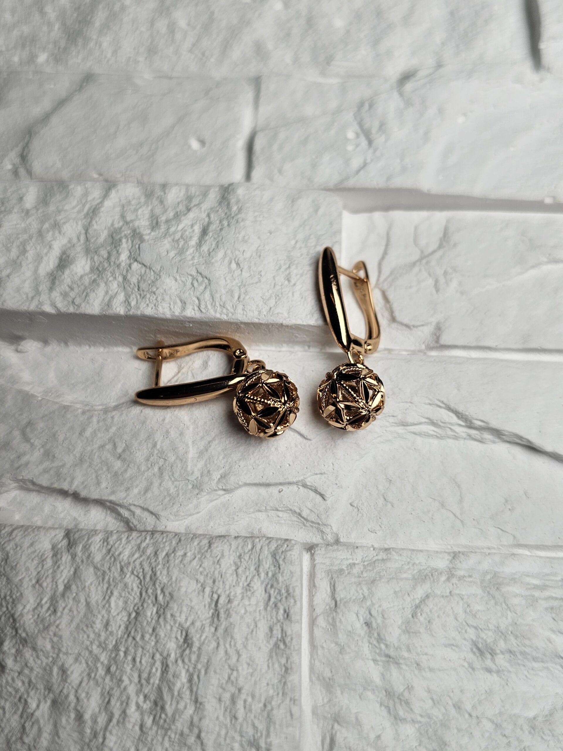 Auksinės spalvos auskarai su išraiškingu rutuliuko formos pakabuku, dekoruotu subtiliais geometriniais raštais. Tai stilingas ir šiuolaikiškas pasirinkimas, suteikiantis įvaizdžiui elegancijos bei išskirtinumo.