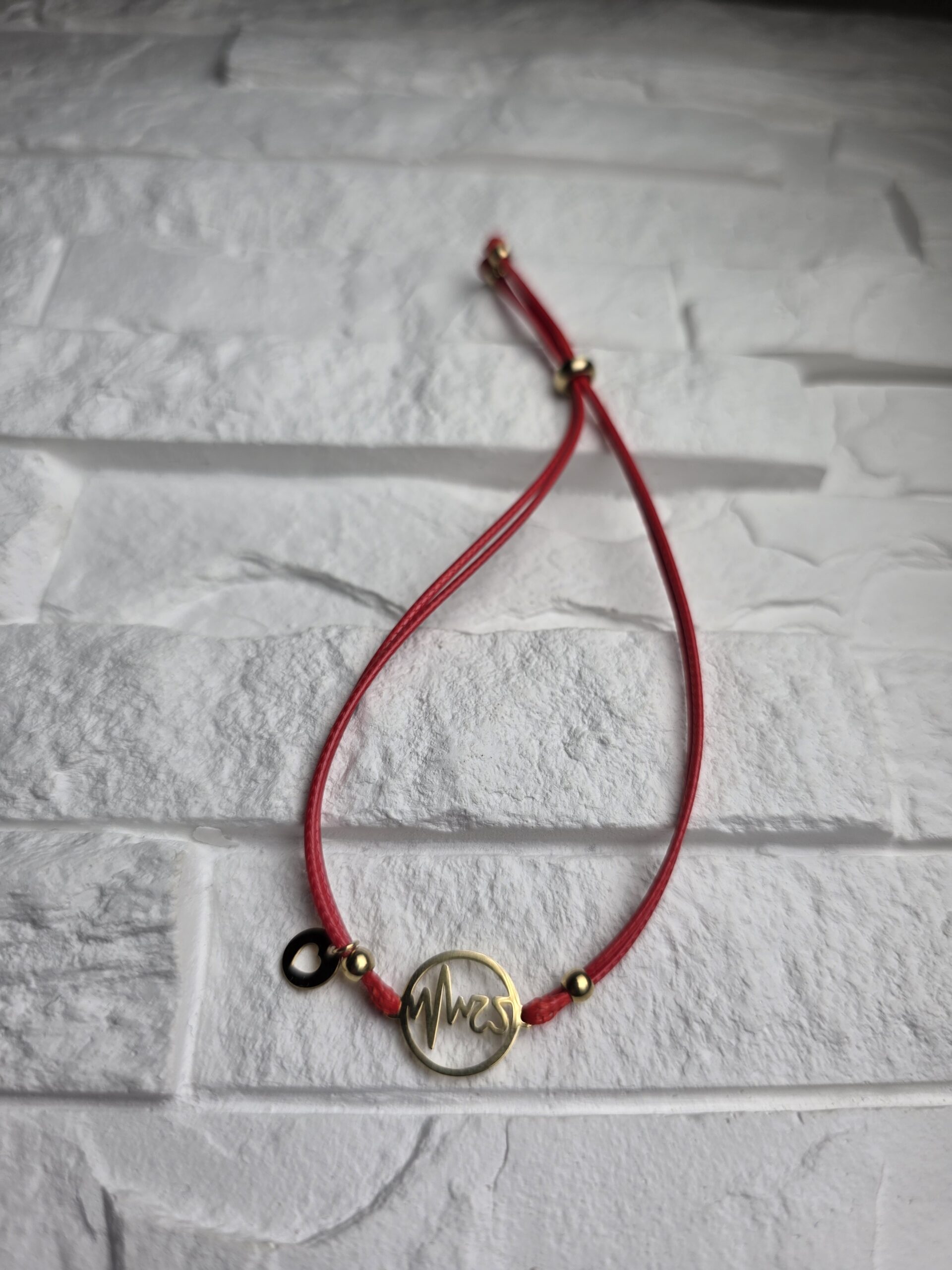 Raudonos virvelės apyrankė su auksinės spalvos širdies ritmo simboliu. Lengva, reguliuojama ir universali. Ryški spalva suteikia išskirtinumo, o motyvas simbolizuoja energiją ir gyvybingumą.