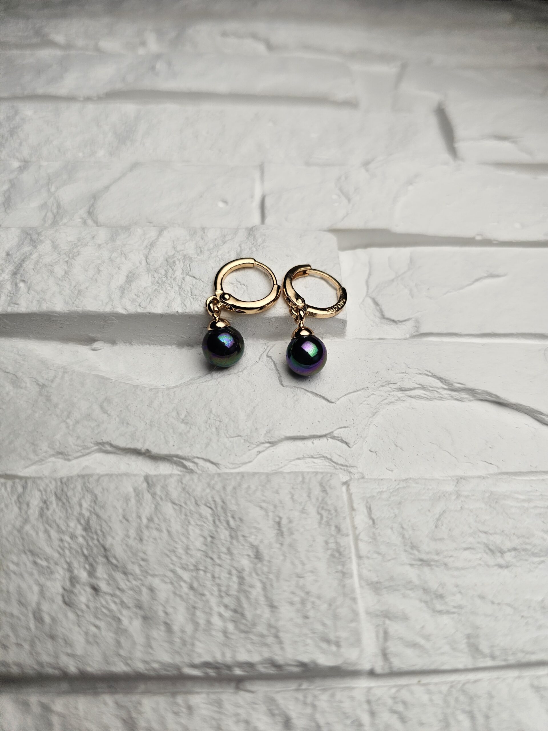 Rafinuoti auskarai su tamsiomis, paslaptingai žvilgančiomis perlo imitacijomis. Auksinės detalės subtiliai pabrėžia jų eleganciją, o šviesoje perlai atskleidžia įvairias spalvų gijas. Puikus pasirinkimas moteriai, vertinančiai išskirtinį, bet subtilų grožį.