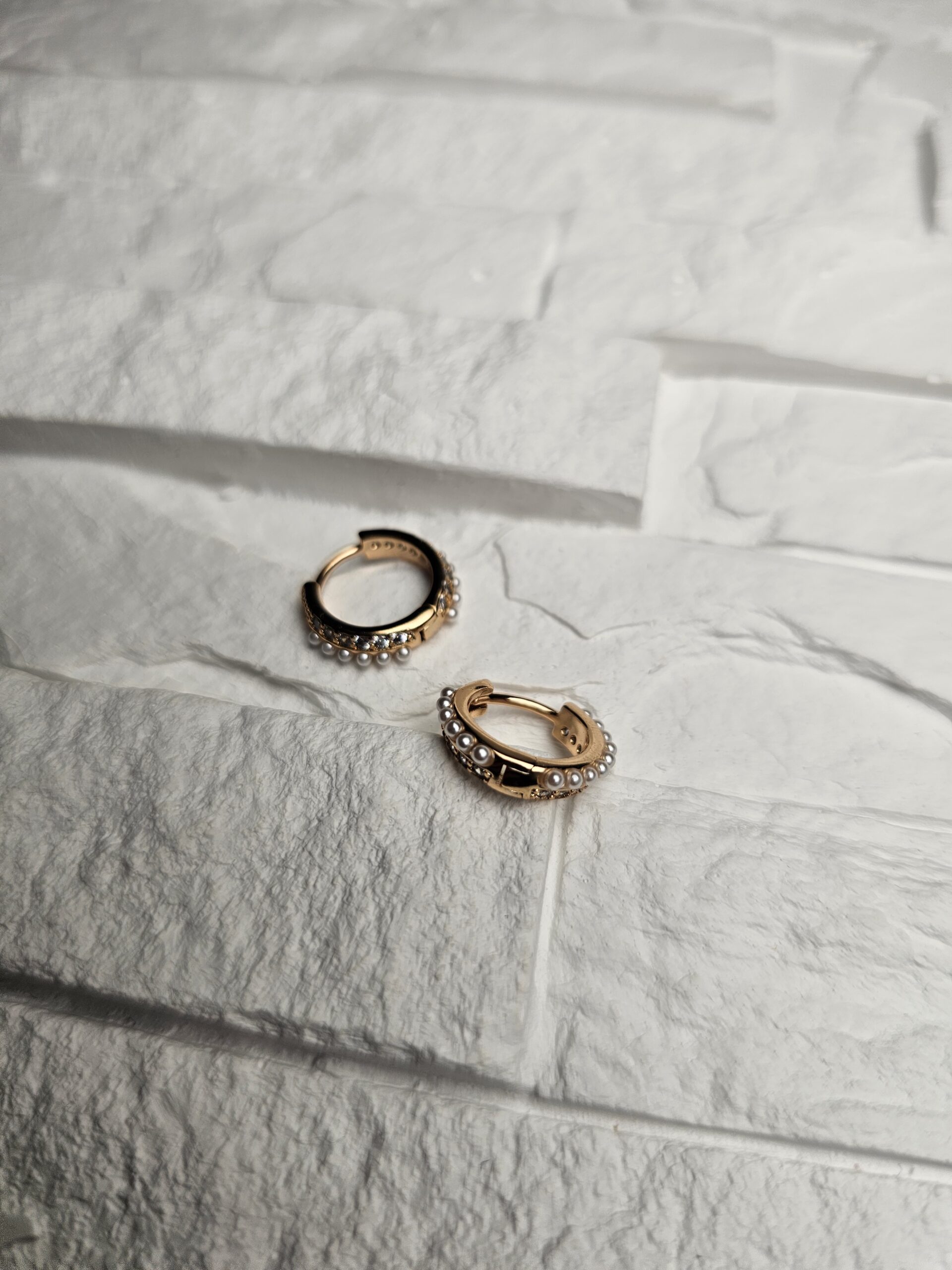 Maži žiedelio formos auskarai dekoruoti smulkiais perlo imitacijos akcentais, suteikiančiais tvarkingą ir subtilų įvaizdį. Stabilus užsegimas leidžia juos dėvėti visą dieną be diskomforto. Tinka kasdienai ir šventei.