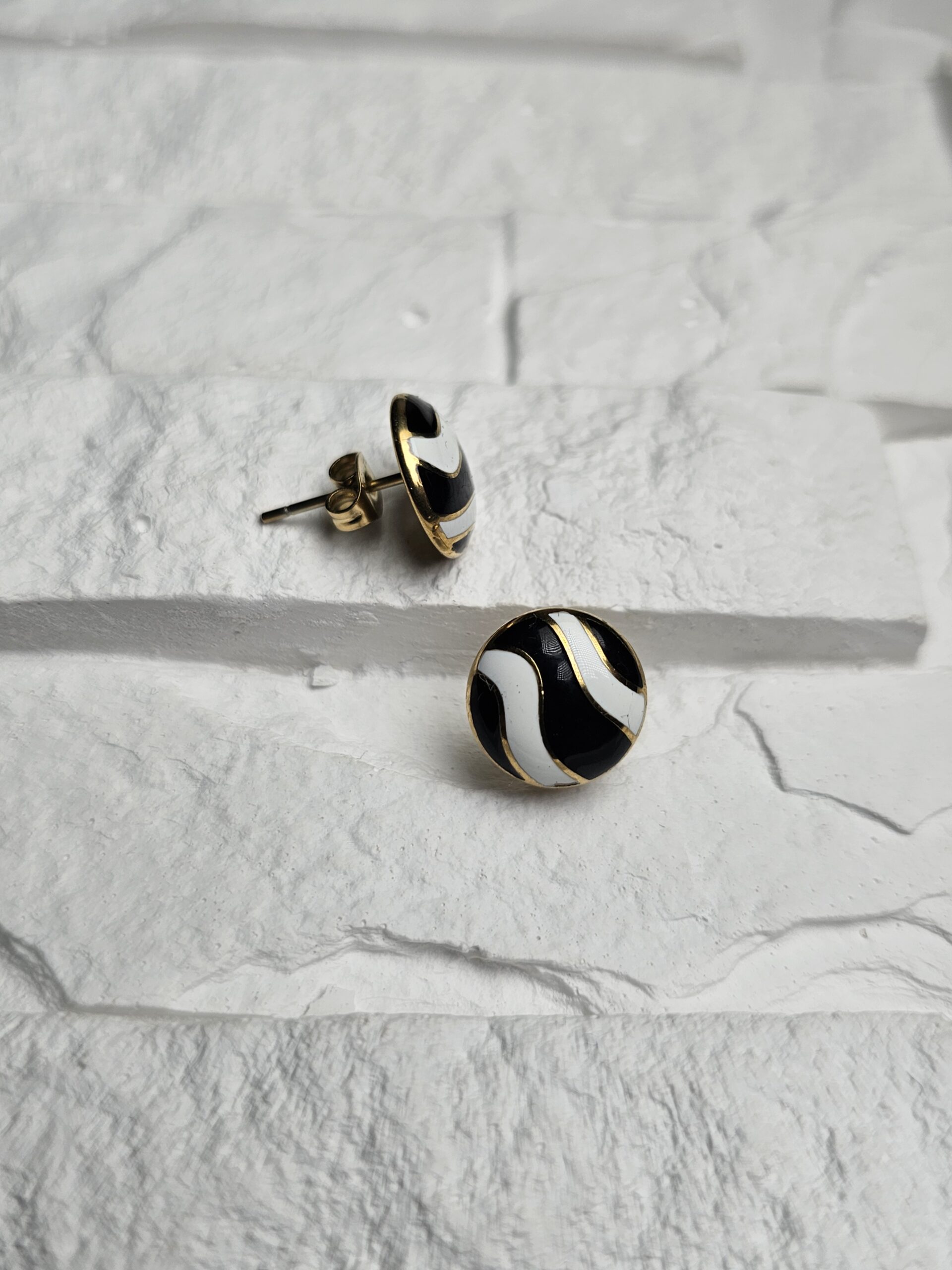 Apvalūs auskarai su juodos ir baltos emalės banga kuria aiškų kontrastą. Forma stabili, todėl auskarai laikosi tvarkingai. Tinka kasdienai ir vakarui.