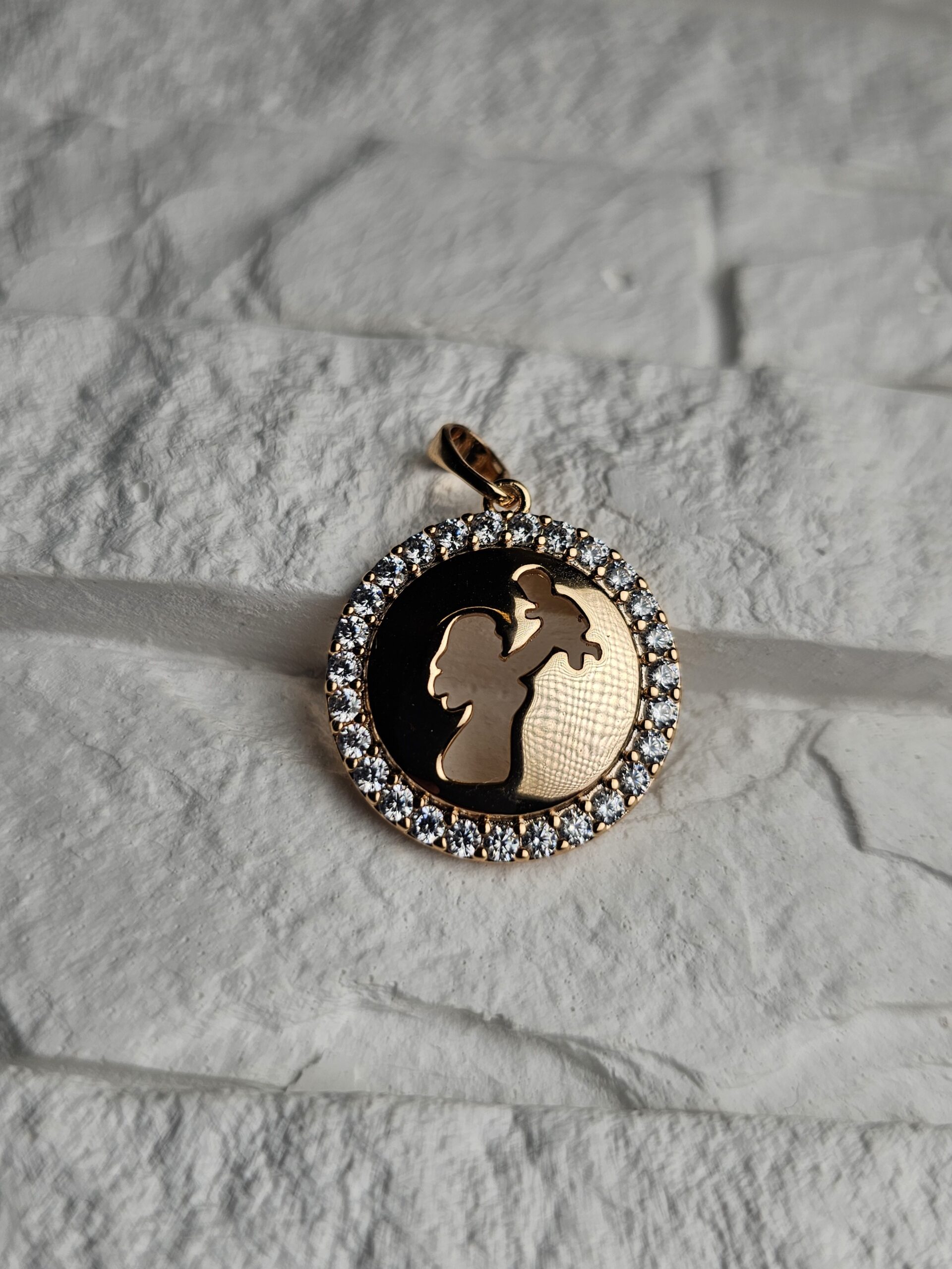 Švelnaus dizaino pakabukas, vaizduojantis motinos ir vaiko siluetą auksiniame fone, apsuptą žėrinčių kristalų ratu. Tai širdį paliečiantis simbolis, perteikiantis begalinę meilę, šilumą ir ryšį tarp mamos ir vaiko. Tobula dovana, išreiškianti nuoširdų dėkingumą ir artumą.