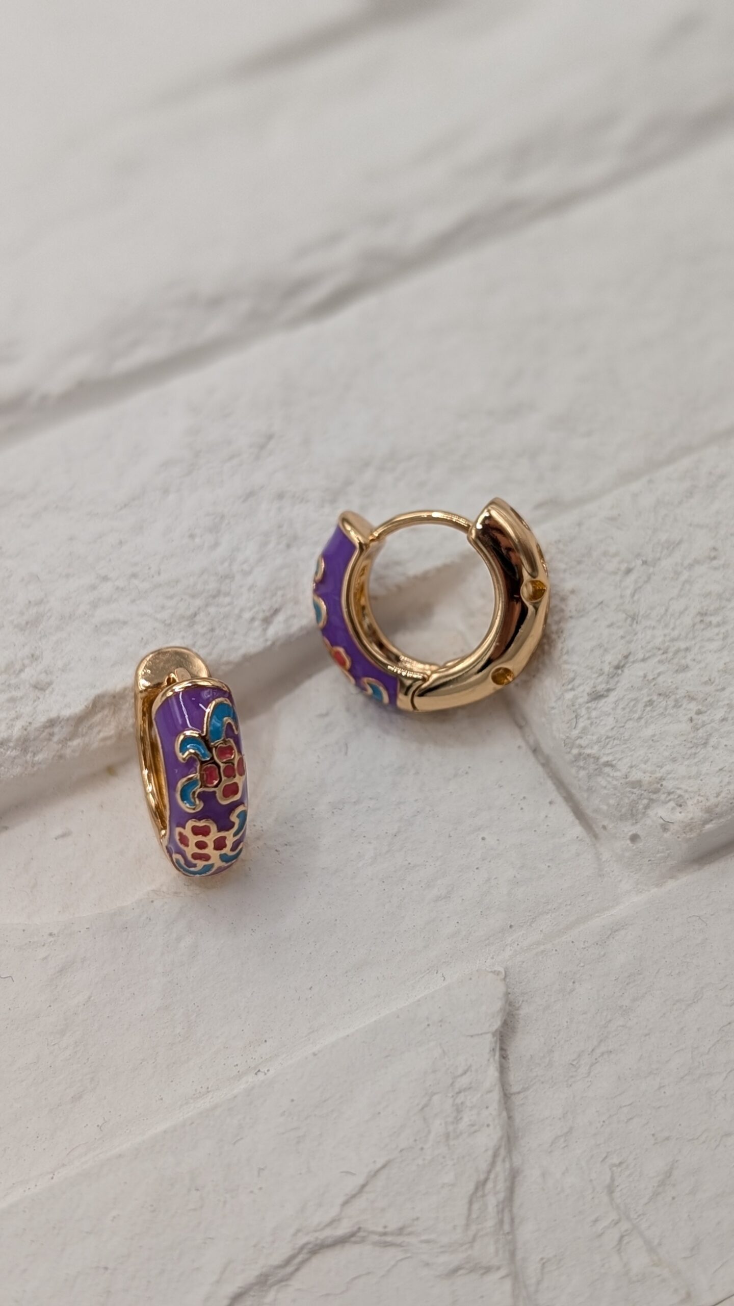 Auksinės spalvos lankelio tipo auskarai su ryškiu violetiniu emaliu ir dekoratyviniais rytietiškais motyvais. Spalvingas, žaismingas ir kartu elegantiškas akcentas, suteikiantis išskirtinumo bet kuriam įvaizdžiui. Lengvi ir patogūs, pagaminti iš hipoalergiško medicininio metalo – tinkami kasdienai ir ypatingoms progoms.