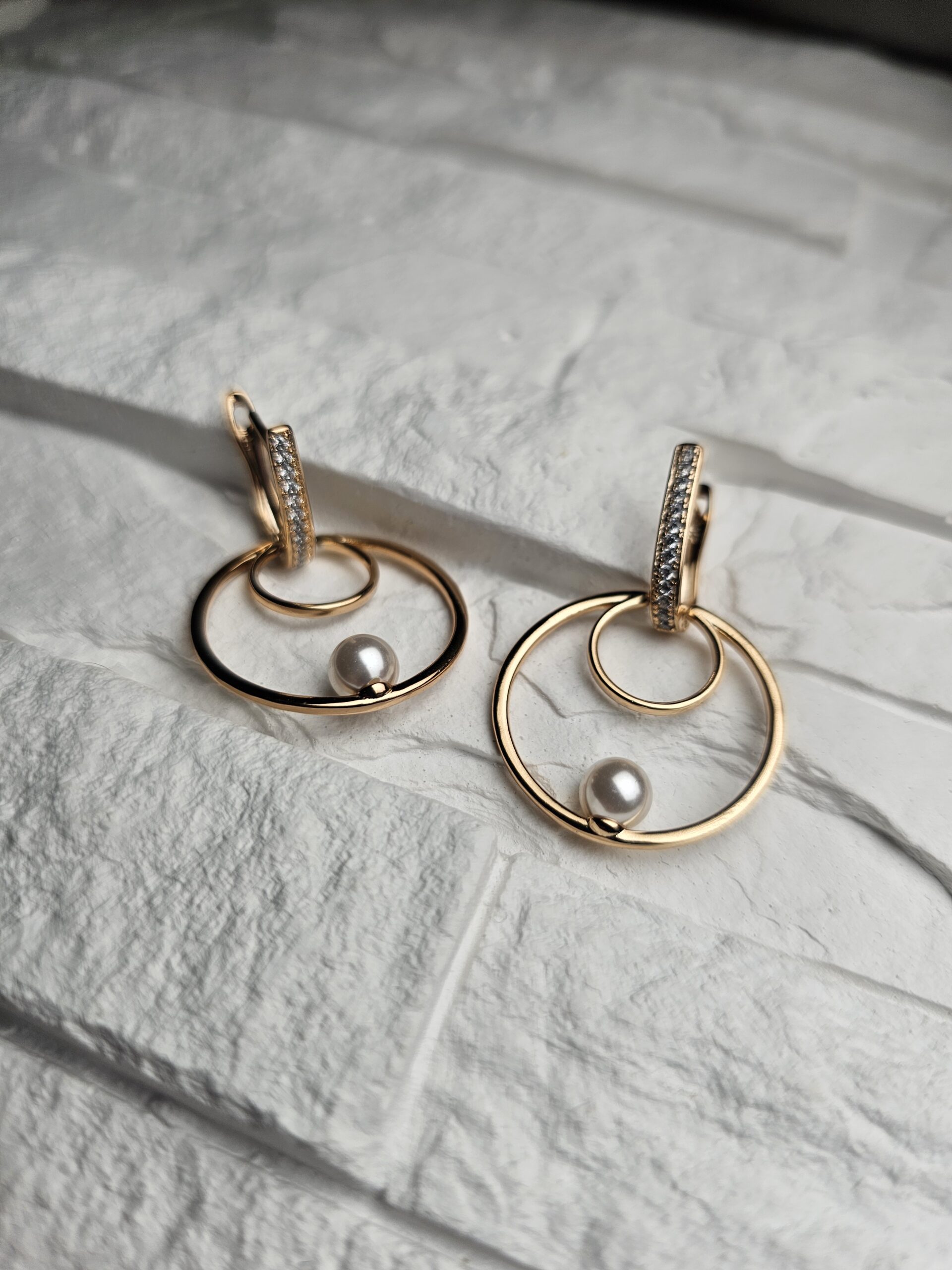 Auksinės spalvos auskarai su perliuku centre ir elegantišku žiedų dizainu. Subtilus spindesys ir moderni forma kuria harmoningą balansą tarp klasikos ir šiuolaikiško stiliaus. Puikiai tinka tiek kasdienai, tiek ypatingoms progoms.