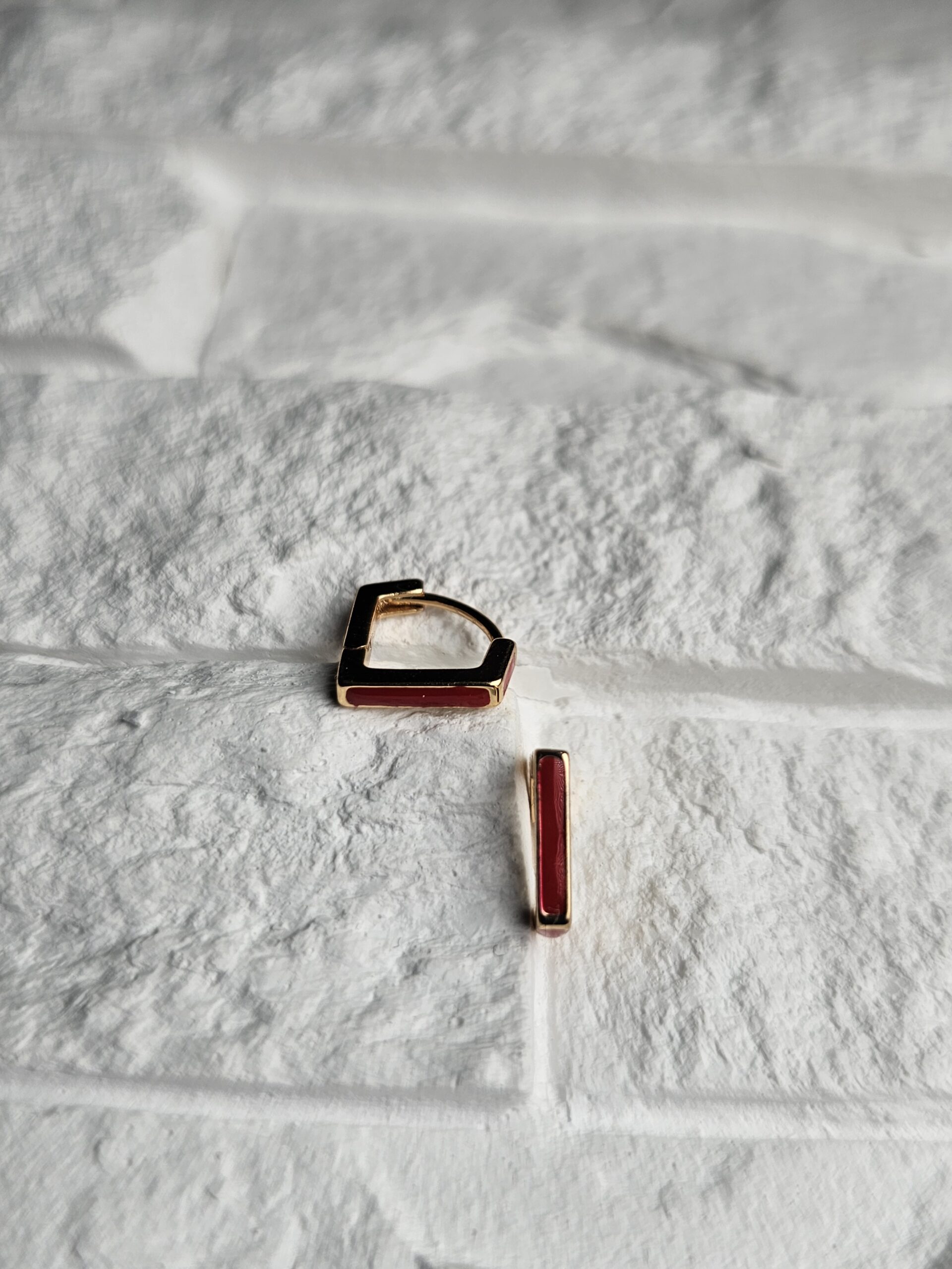 Modernūs auskarai su ryškiai raudonu akcentu, įrėmintu auksinio tono pagrinde. Minimalistinis dizainas sukuria išskirtinį kontrastą tarp spalvos ir formos, suteikdamas įvaizdžiui energijos ir drąsos. Puikus pasirinkimas stilingai ir savimi pasitikinčiai moteriai.