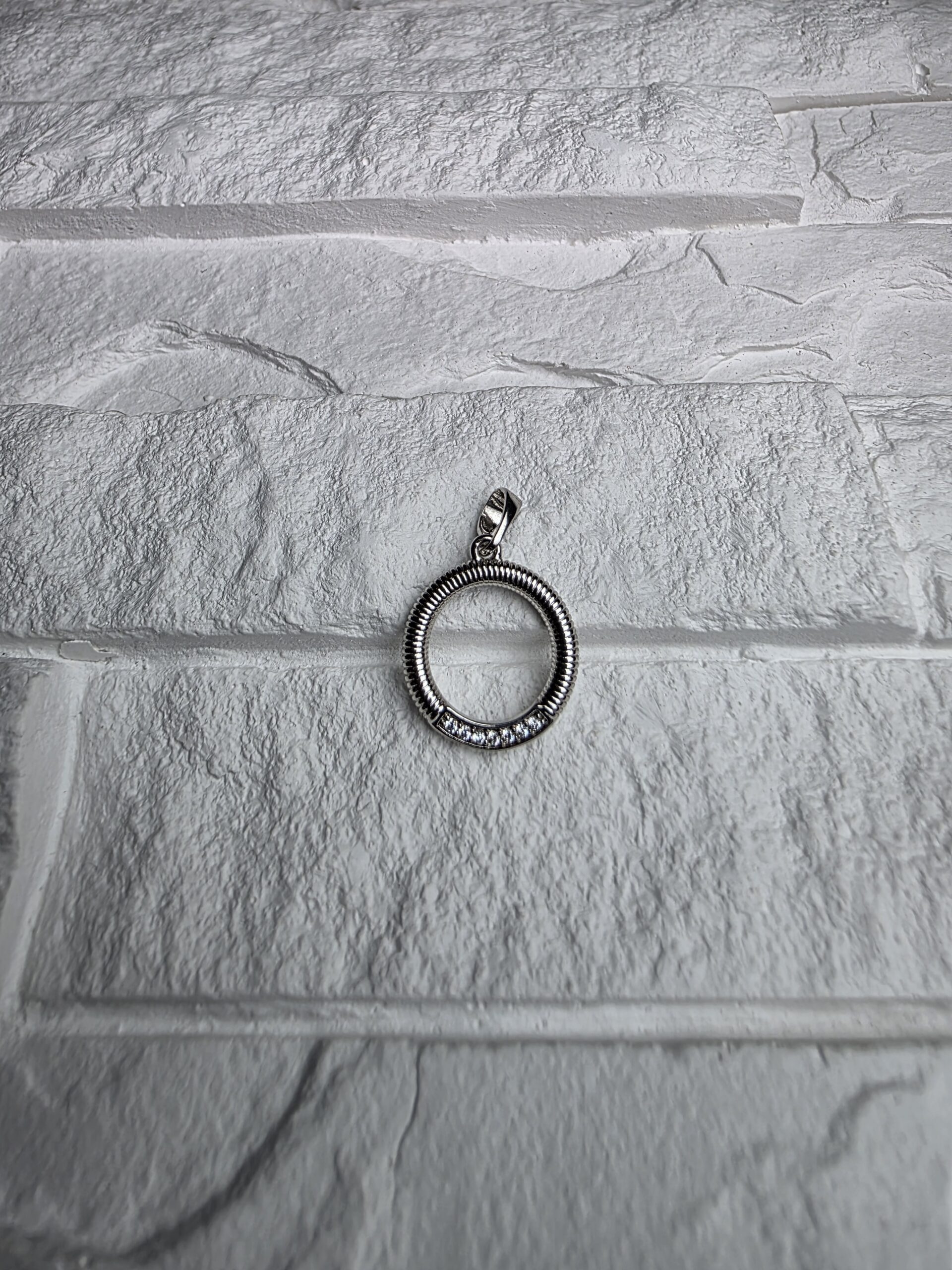 Sidabrinės spalvos apskritimo formos pakabukas su subtiliu cirkonių lankeliu apačioje. Paviršius dekoruotas smulkiais grioveliais, todėl aksesuaras atrodo išraiškingas ir lengvai derinamas prie bet kokios grandinėlės.