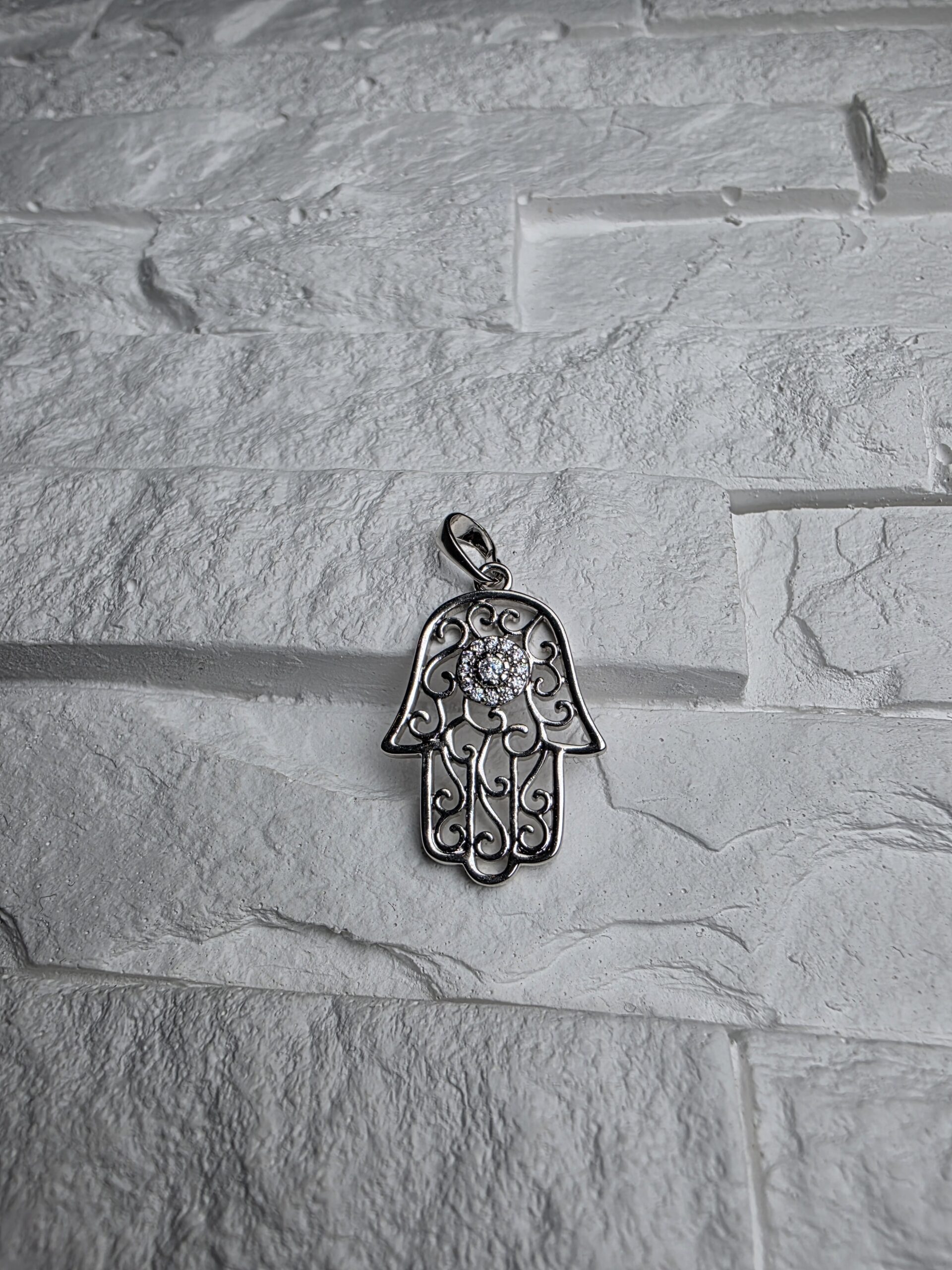 Sidabrinės spalvos pakabukas su ažūrine Hamsos delno forma. Centre – ryškiai spindintis akmenų ratas, suteikiantis papuošalui prabangos ir išskirtinumo. Lengvas, universalus ir tinkantis kasdieniam dėvėjimui prie bet kurios grandinėlės.