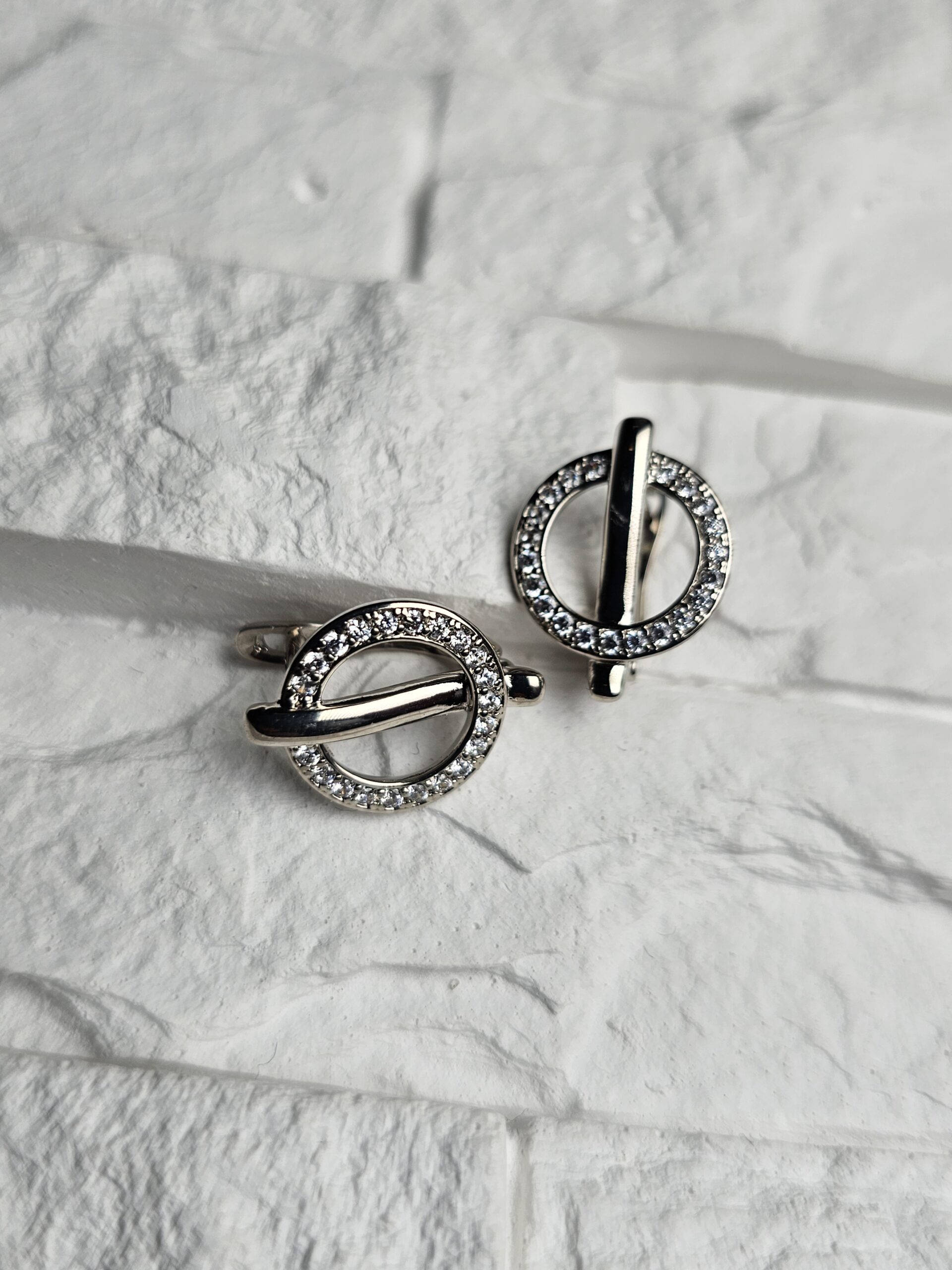 Modernūs sidabro atspalvio auskarai su žėrinčiais kristalais, subtiliai įrėminančiais apskritimo formą. Geometrinis dizainas simbolizuoja pusiausvyrą ir darną, o švelnus spindesys suteikia elegancijos ir išskirtinumo. Tinka tiek kasdienai, tiek vakariniam įvaizdžiui.