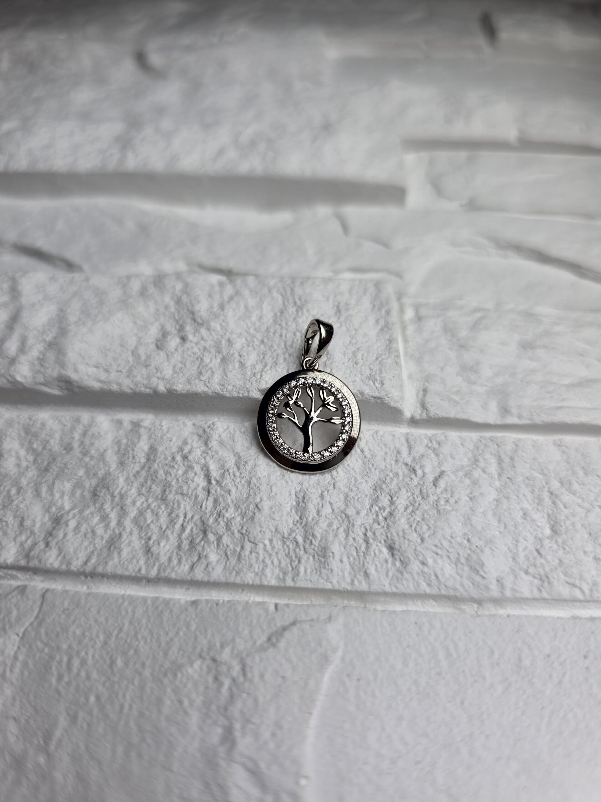 Sidabro spalvos gyvybės medžio pakabukas su cirkoniais aplink rėmelį. Minimalus dizainas suteikia švarų siluetą, o medžio motyvas simbolizuoja tvirtą pagrindą ir augimą. Tinka kasdieniam nešiojimui.