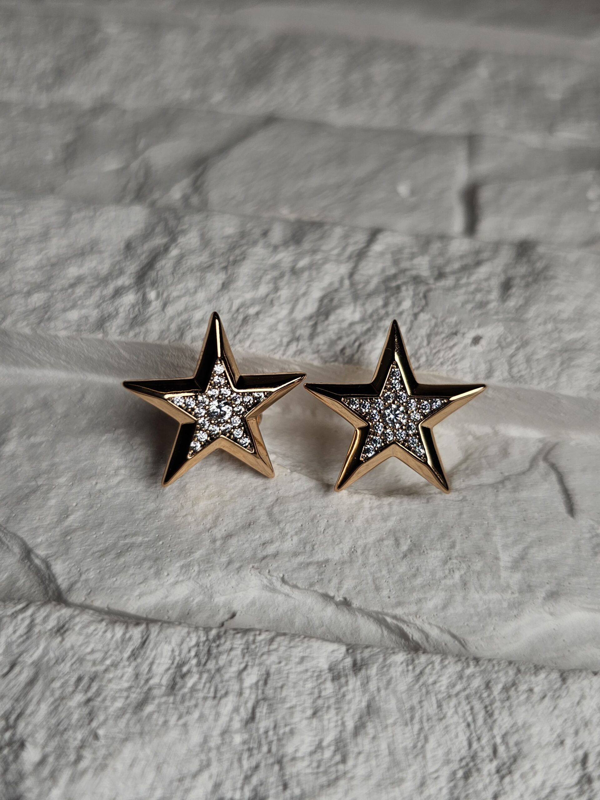 Spindinčios žvaigždės formos auskarai, dailiai inkrustuoti cirkonio akmenėliais, subtiliai atspindinčiais šviesą. Auksinis atspalvis suteikia šilumos ir žavesio, o žvaigždžių dizainas – žaismingumo bei išskirtinumo. Tobulas pasirinkimas tiek kasdieniam spindesiui, tiek vakariniam įvaizdžiui.