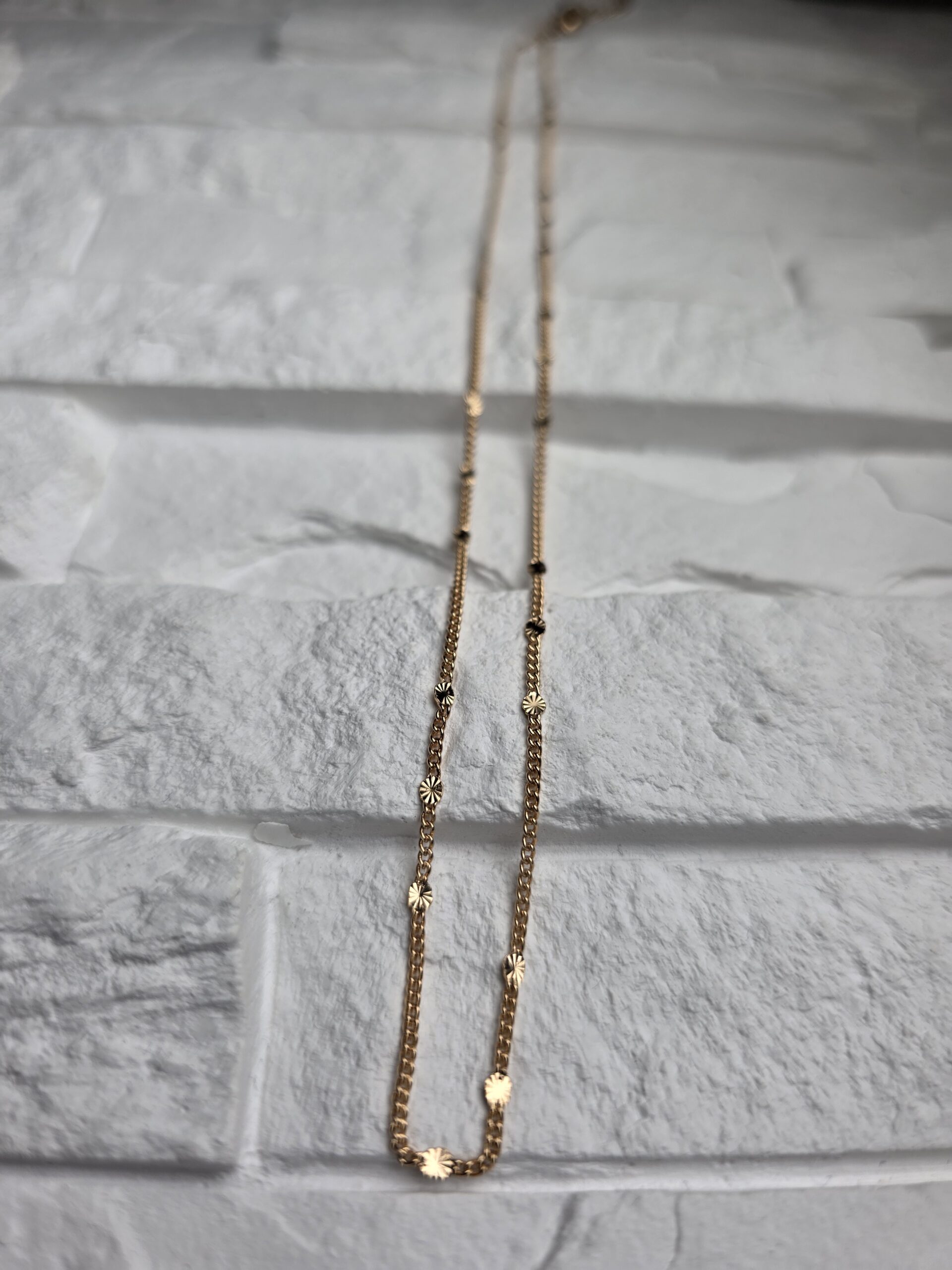 Auksinės spalvos grandinėlė su mažais saulės formos akcentais. Lengvas dizainas suteikia žaismingumo, o subtilūs elementai išlaiko eleganciją. Tinka tiek kasdienai, tiek sluoksniavimui su kitomis grandinėlėmis.