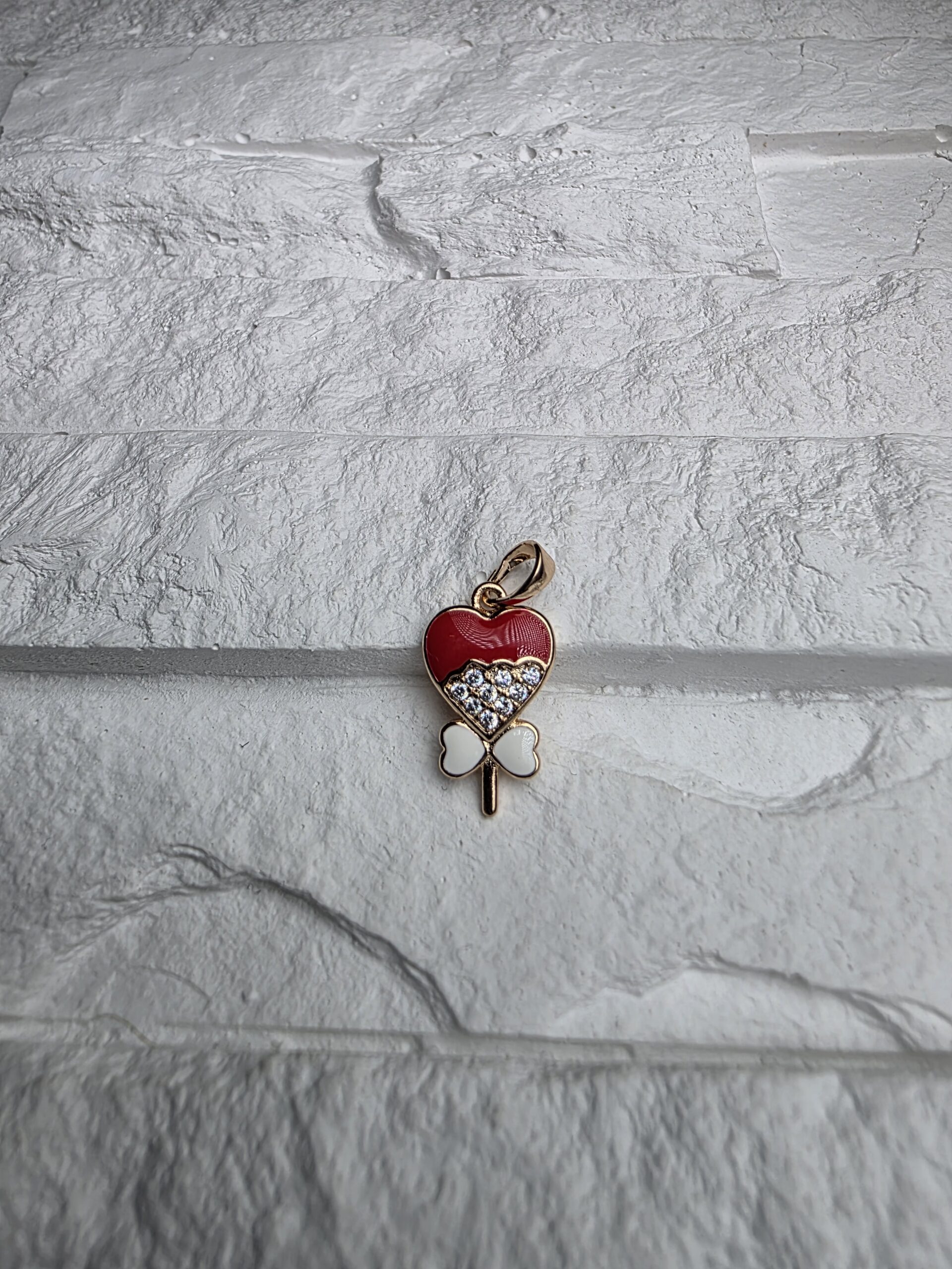Ryškiai raudona širdelė su baltu drugeliu ir blizgiais kristalais suteikia žaismingą, saldų akcentą. Pakabukas lengvas, aiškios formos ir matomas iškart, todėl puikiai tinka prie paprastų grandinėlių.