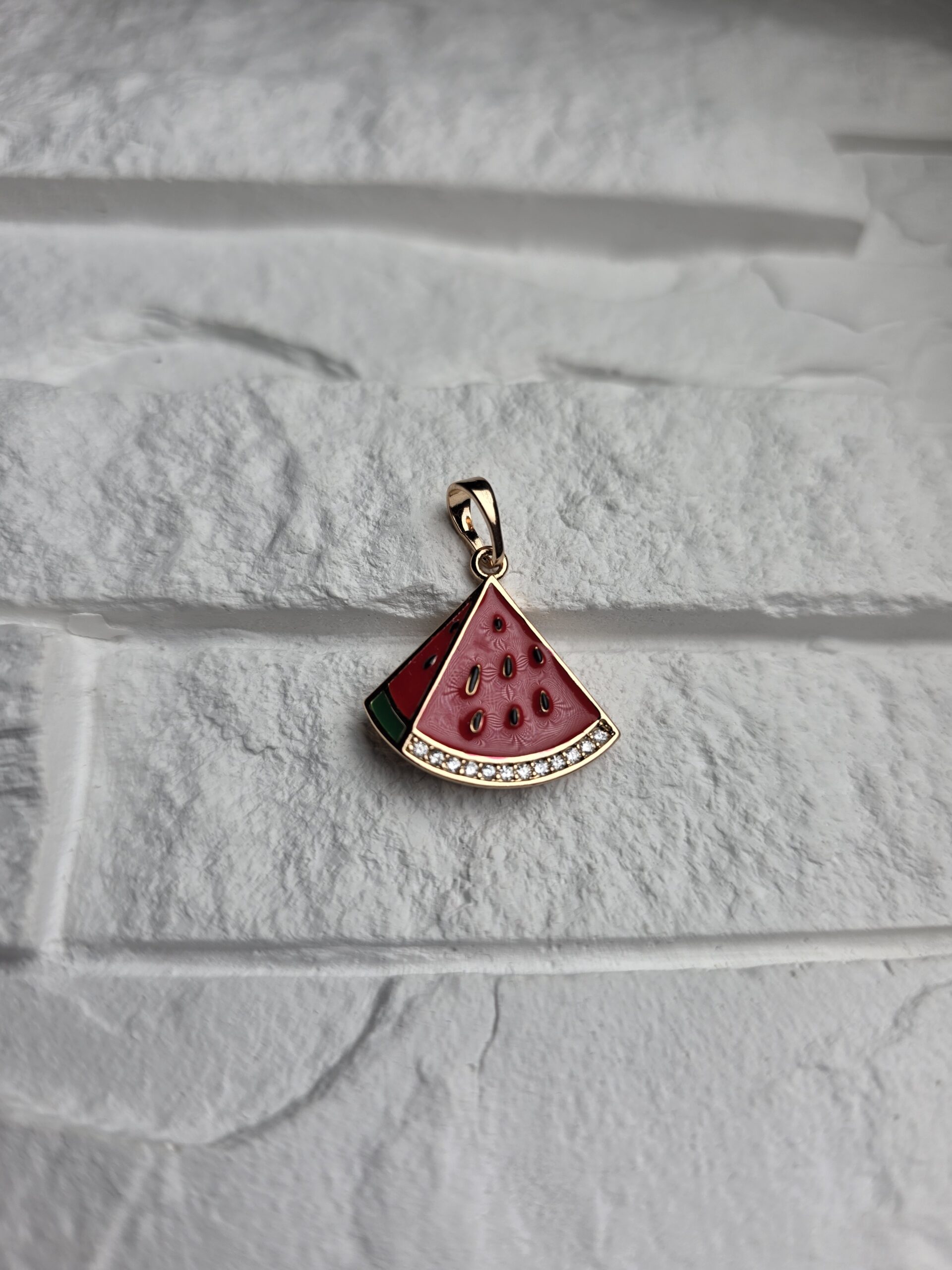 Smagus pakabukas su arbūzo gabalėliu kuria vasaros nuotaiką. Raudona emalė, žalsvas kraštas ir cirkonių juostelė suteikia ryškų, žaismingą akcentą bet kuriai grandinėlei.