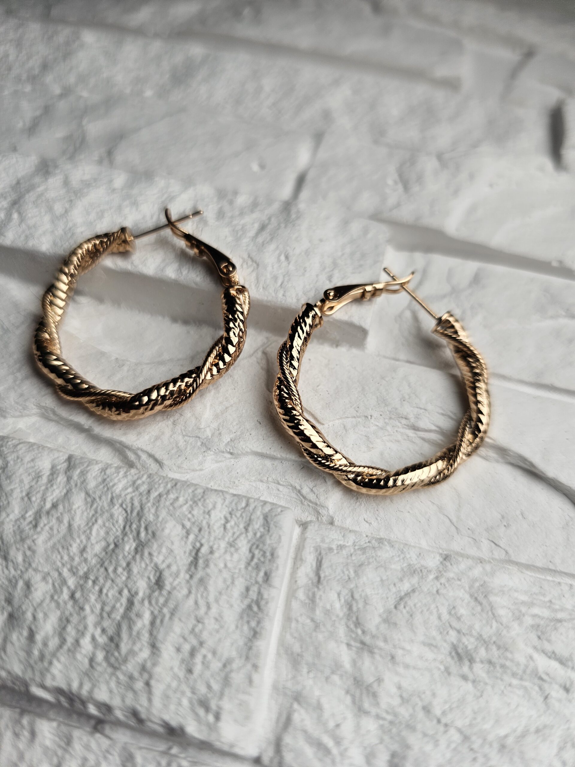 Auksinės spalvos lankelio tipo auskarai su ryškiai išraižyta, persukta tekstūra. Paviršiaus blizgesys sukuria aiškų, matomą efektą, todėl auskarai išsiskiria be papildomų detalių. Tinka kasdienai ir vakarui, kai reikia paprasto, bet pastebimo akcento.