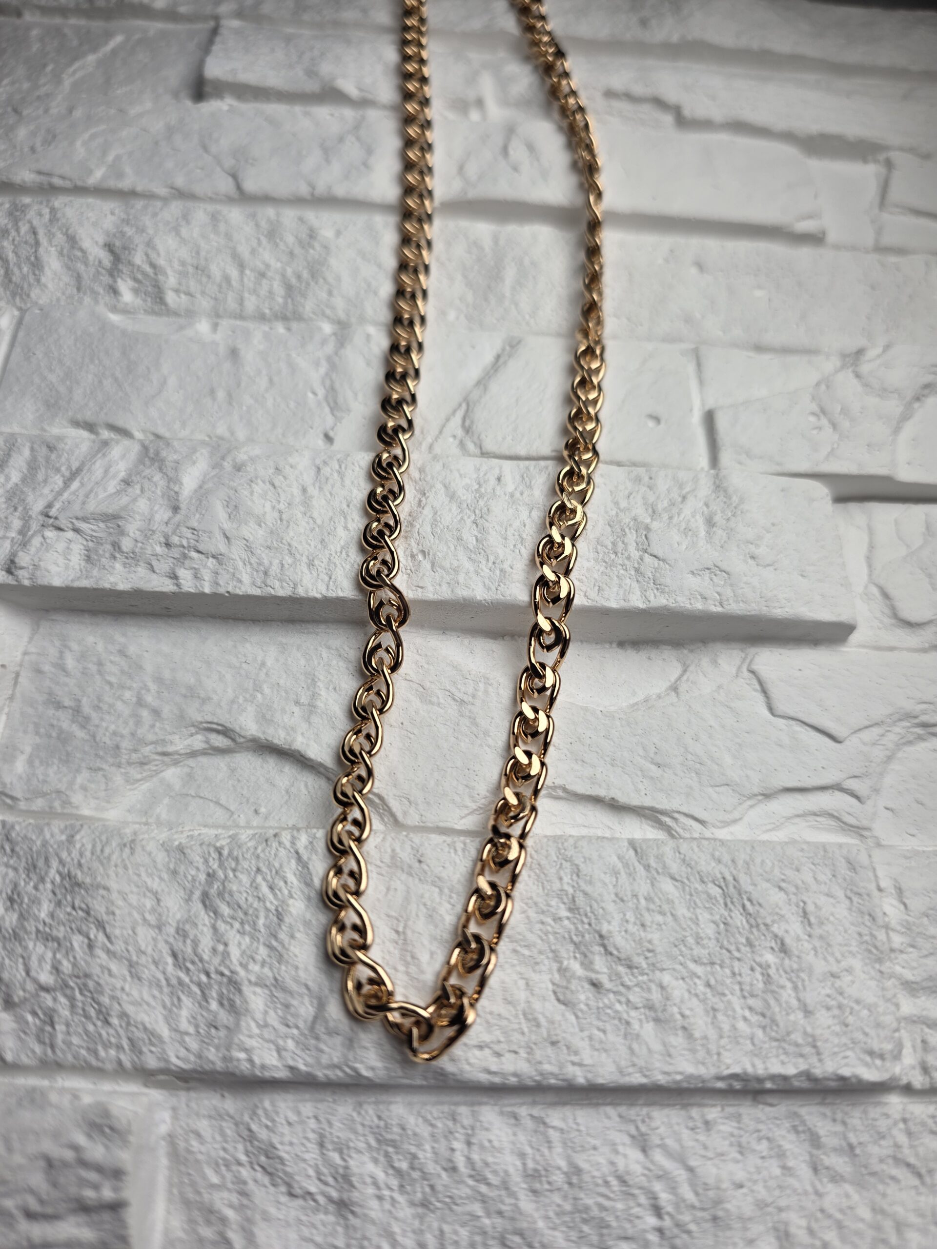 Auksinės spalvos grandinėlė iš suktų ovalo formos narelių. Vizualiai vidutinio storio, lengvai blizgi. Tinka kasdienai ir dera su daugeliu pakabukų. Stabilus ir švarus siluetas.